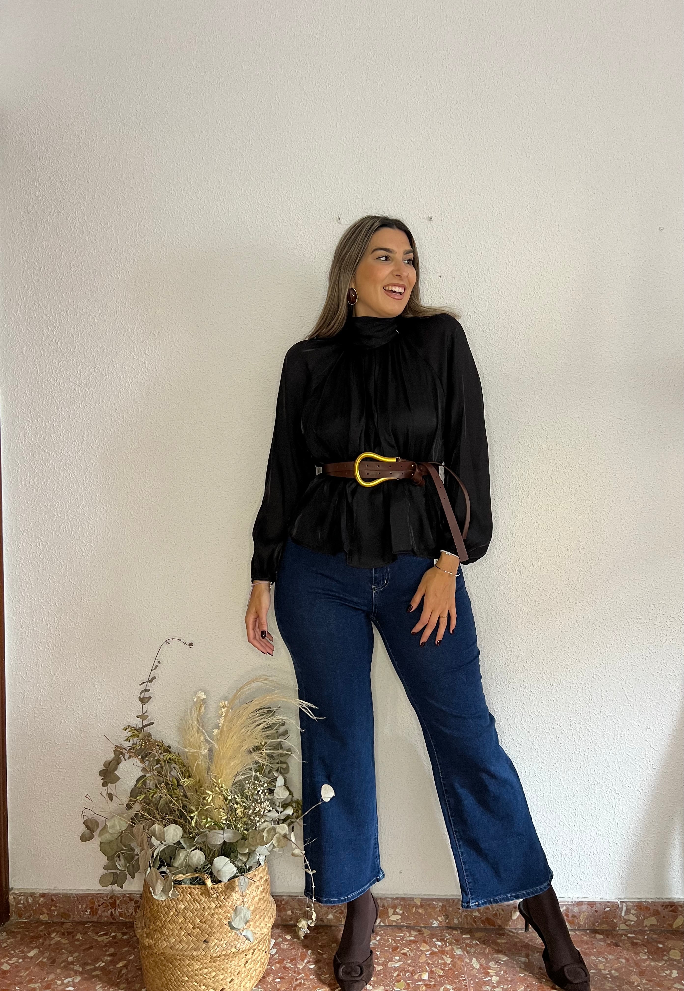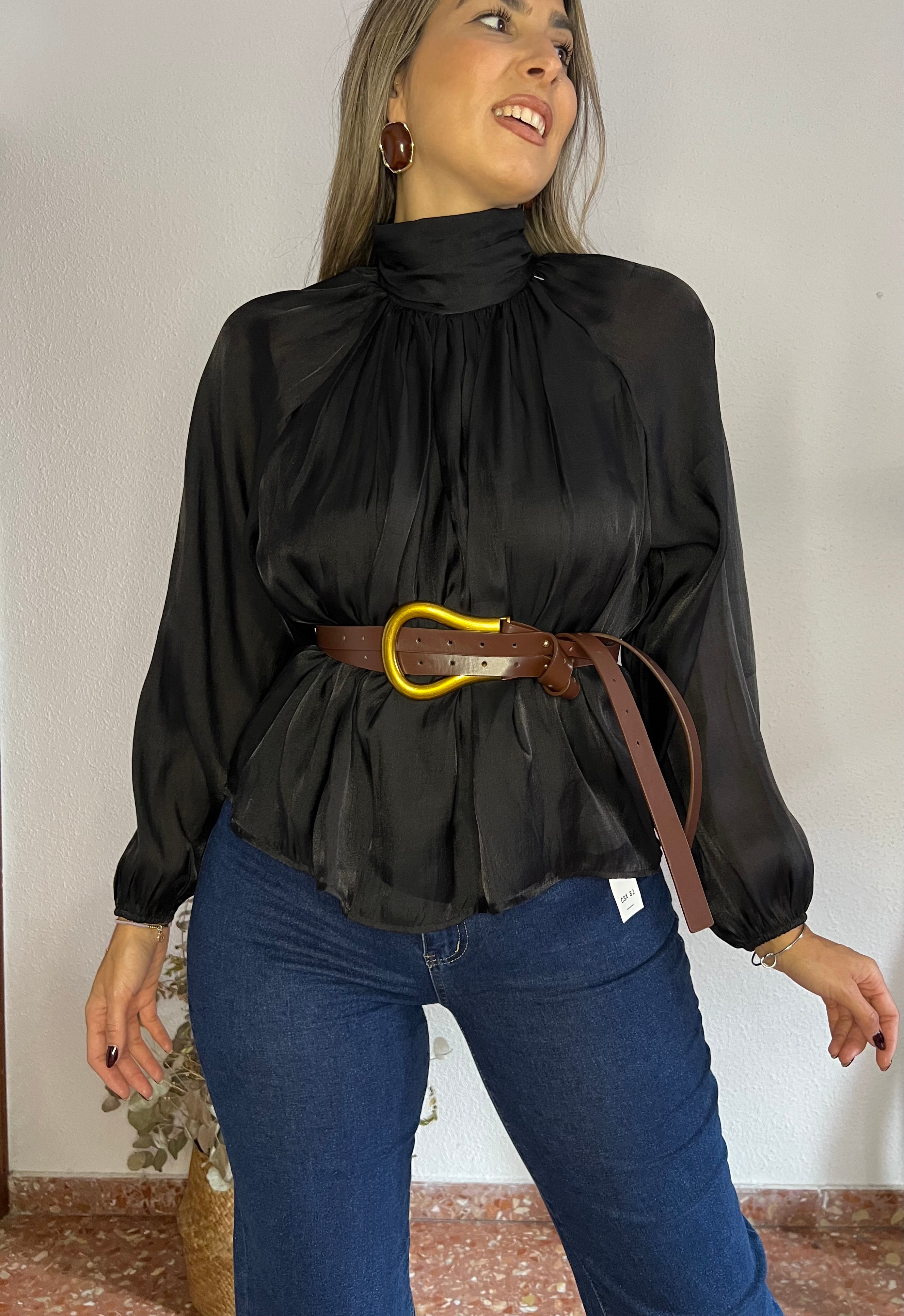 Blusa de corte fluido, cuello subido, tiene un forro interior y brillo.