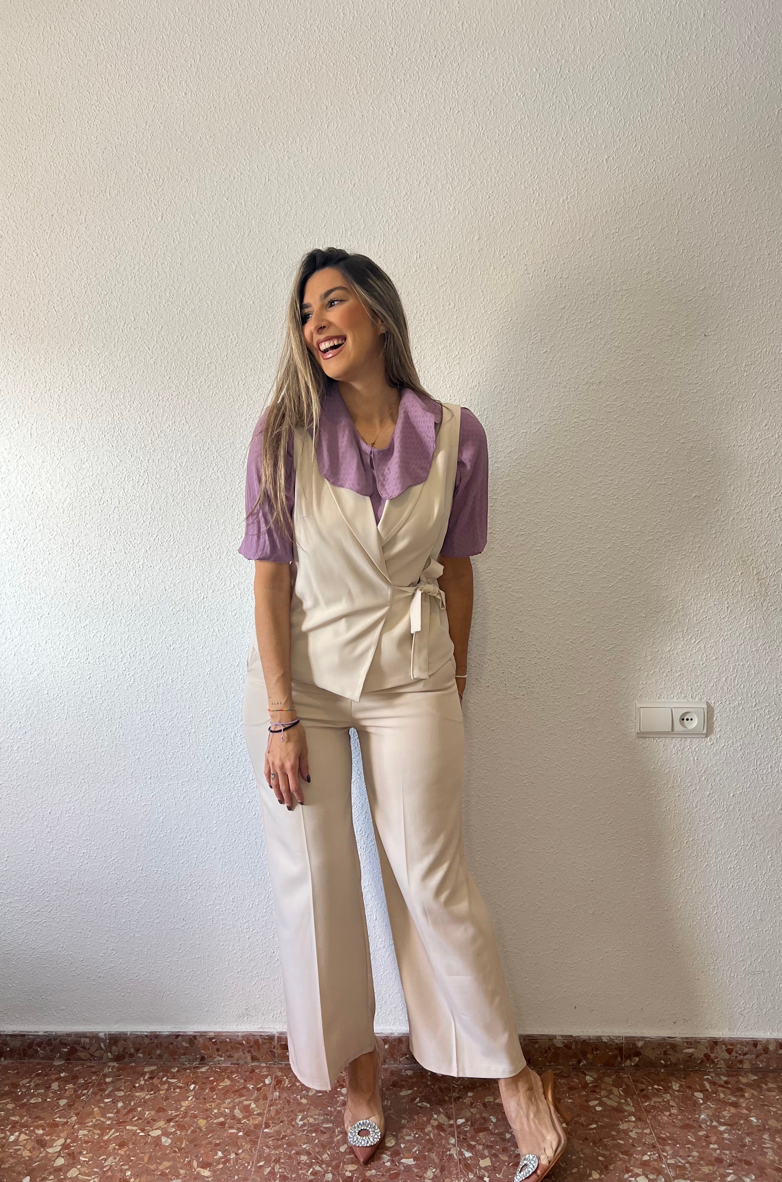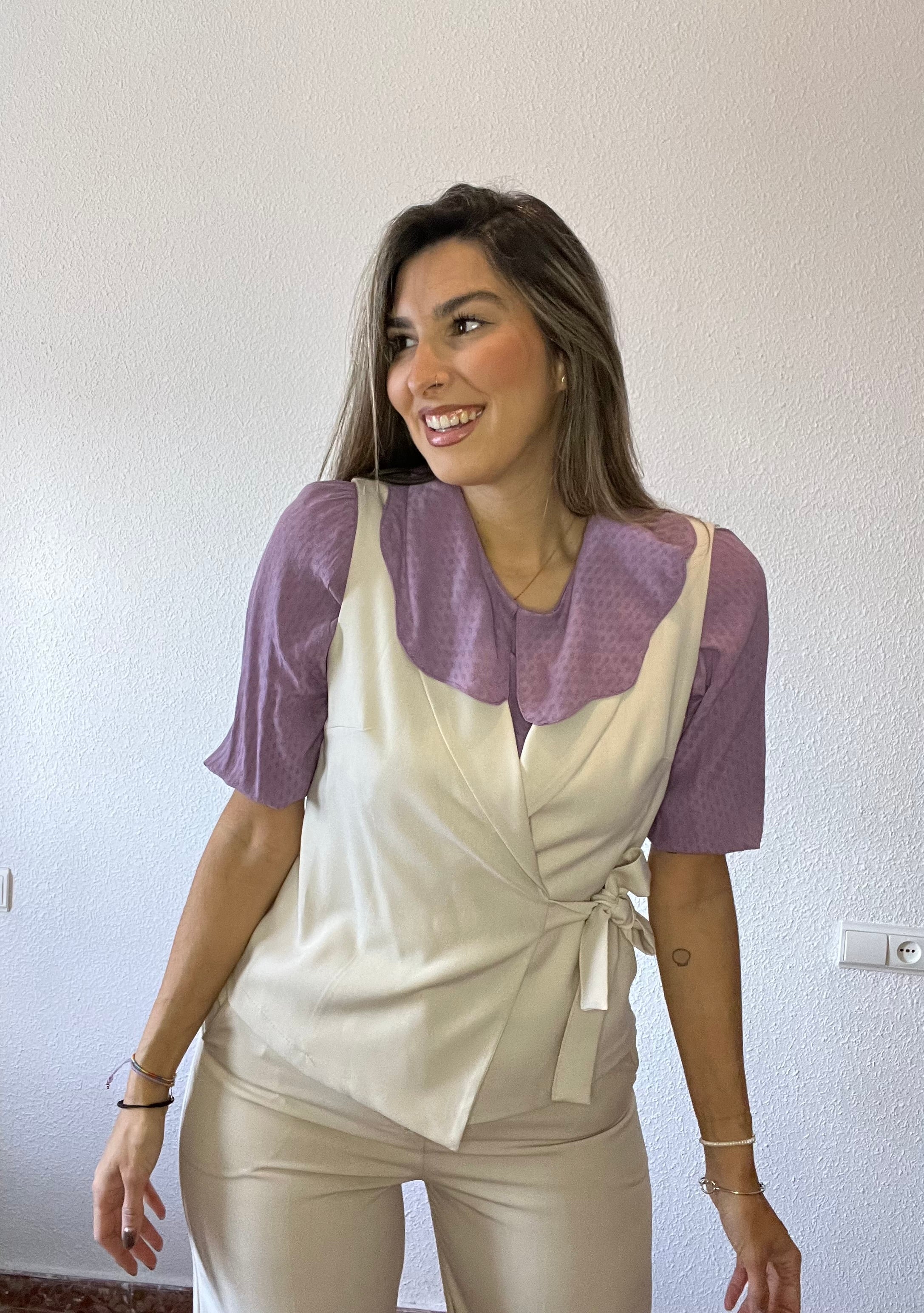 Chaleco cruzado con detalle de lazo en el lateral.