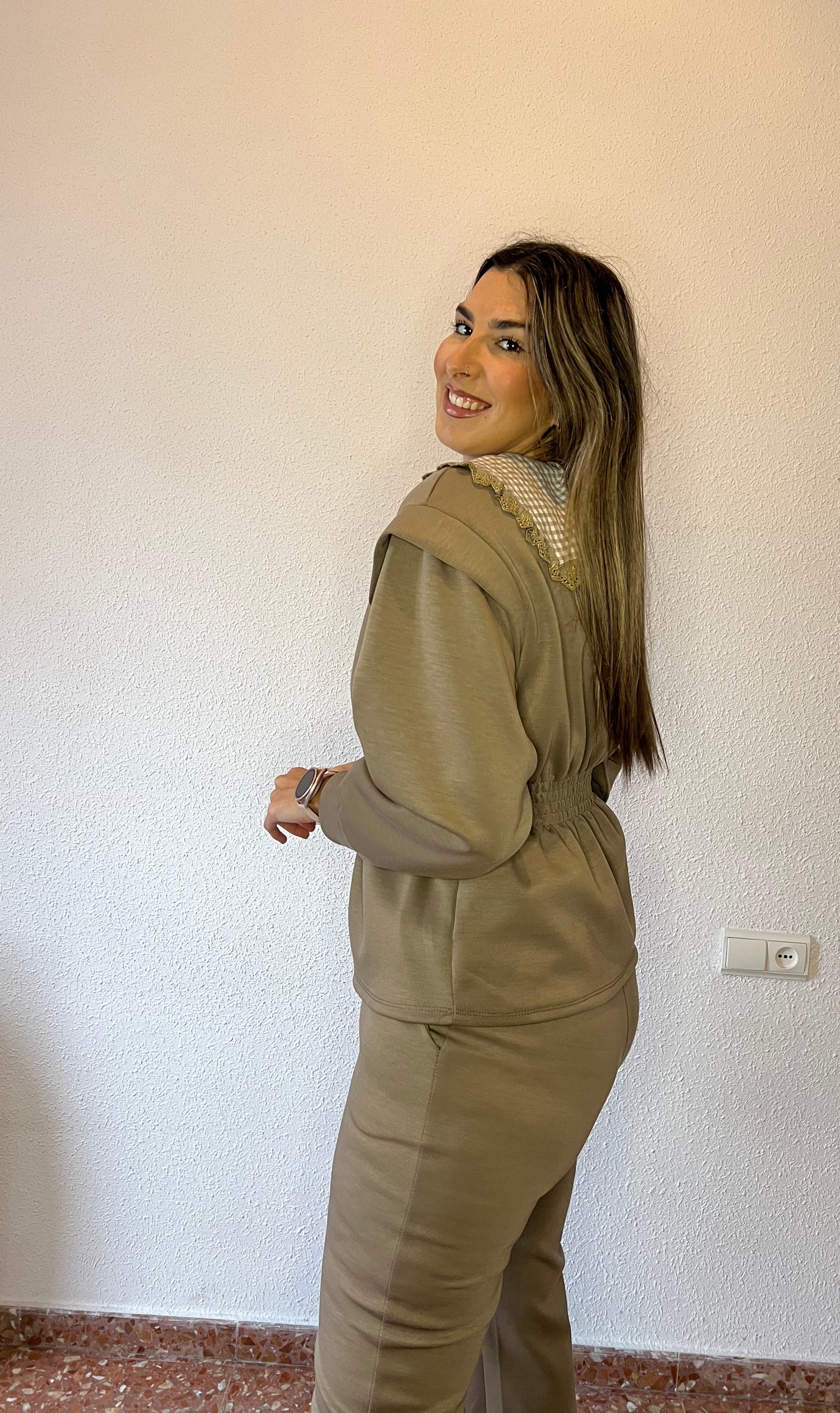 Conjunto de pantalón tipo jogger y sudadera con detalle de volante en el bajo.