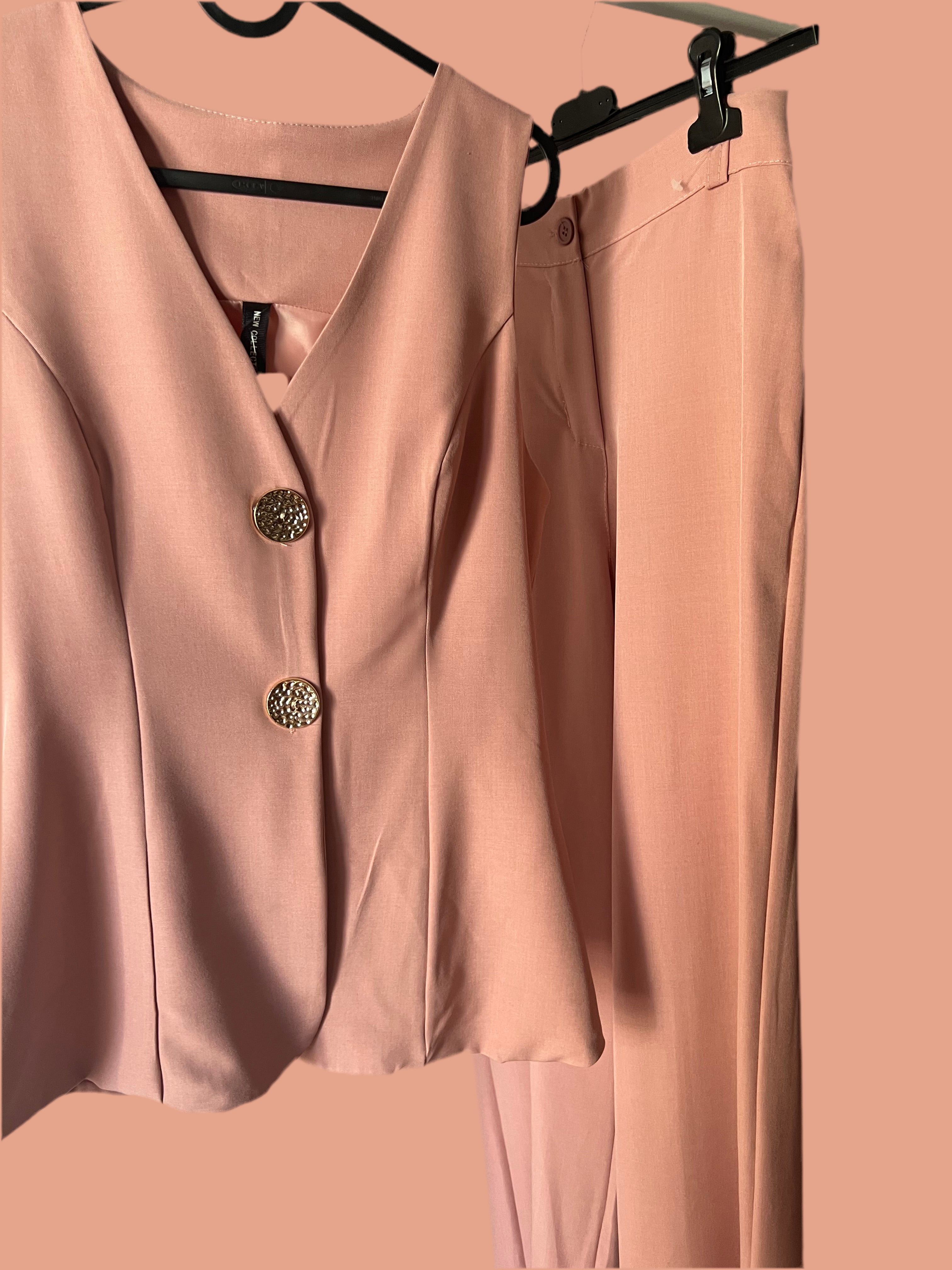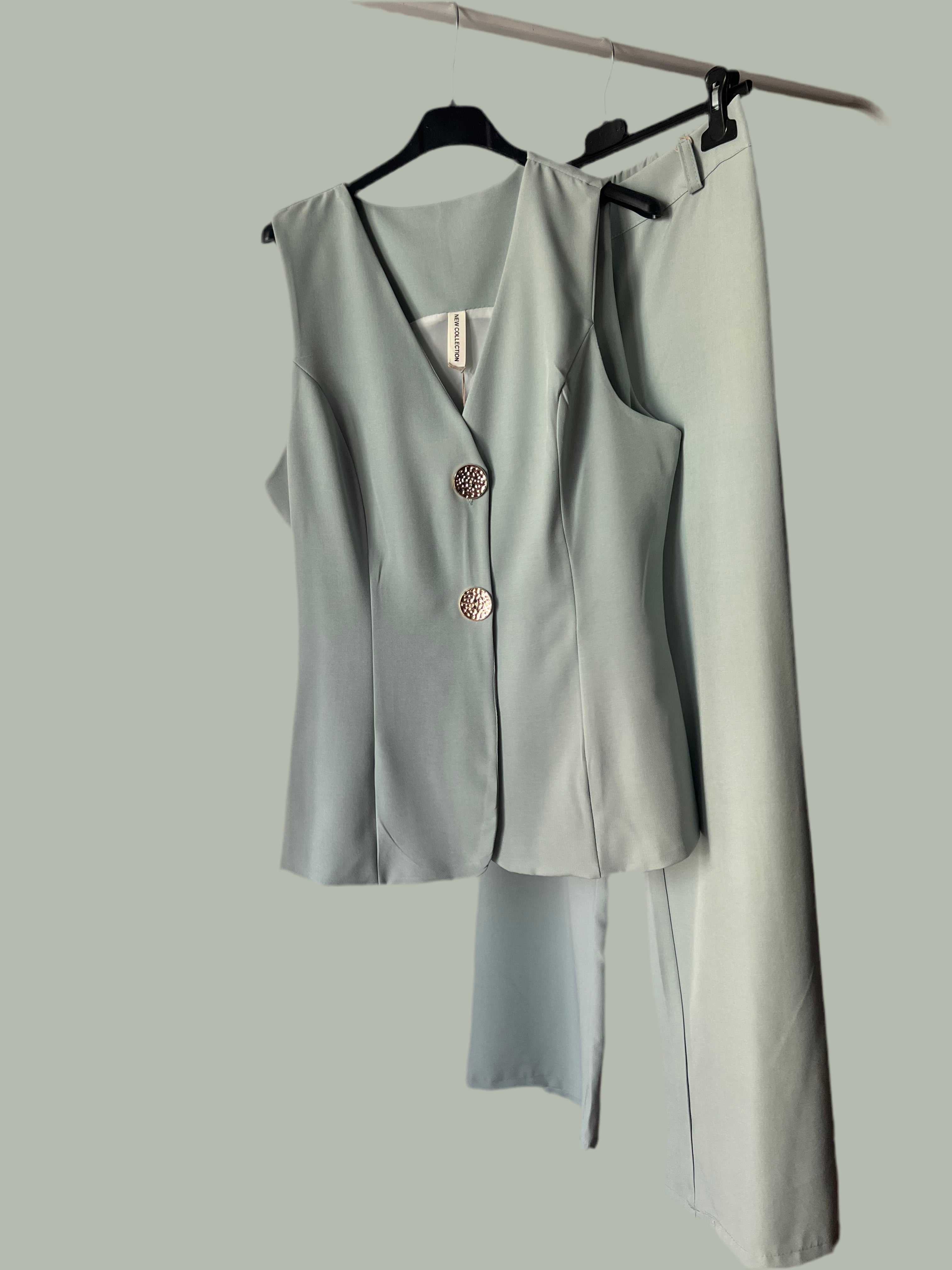 Chaleco corte blazer con botones dorados y pantalón de talle alto, corte fluido y cintura elástica en la parte trasera.