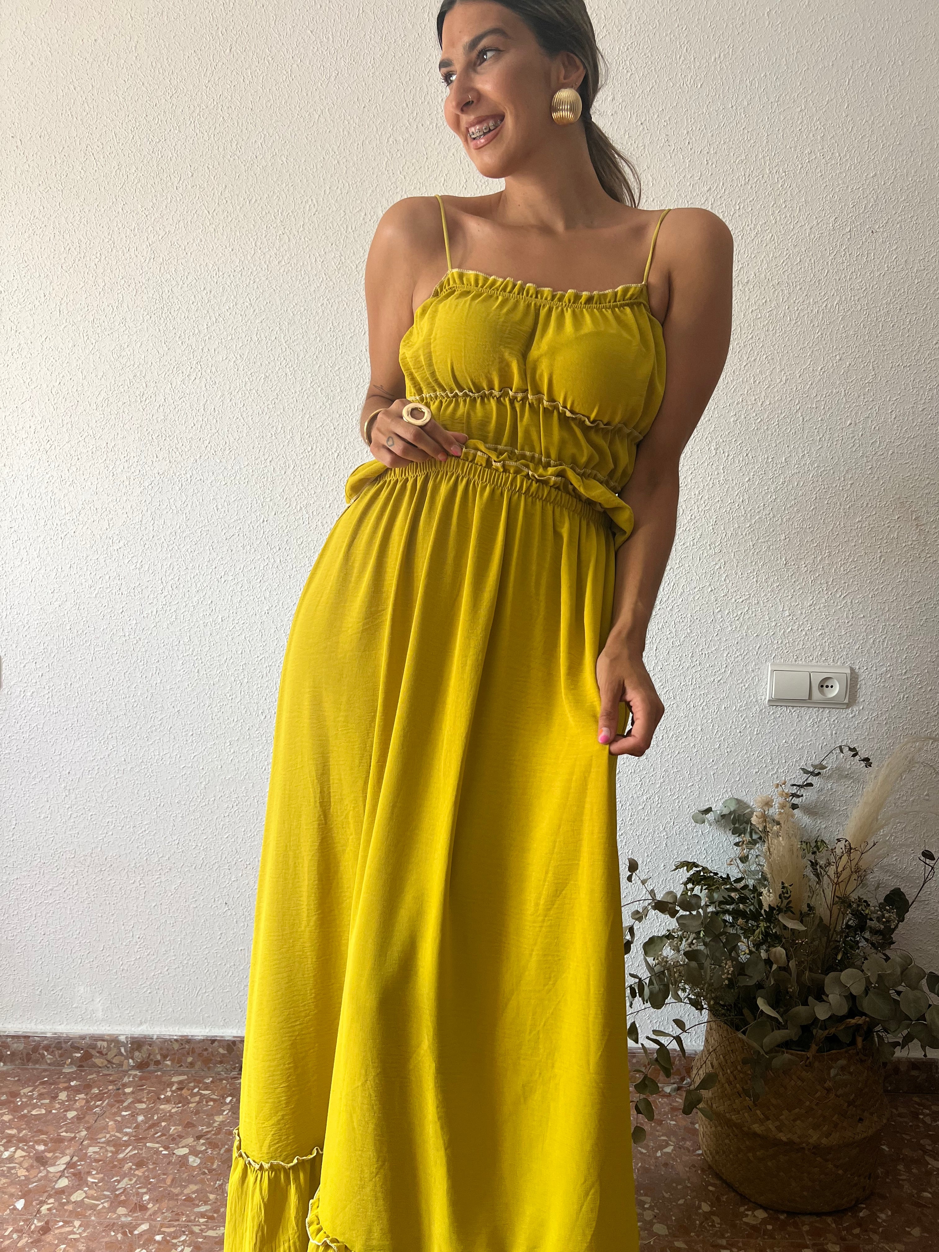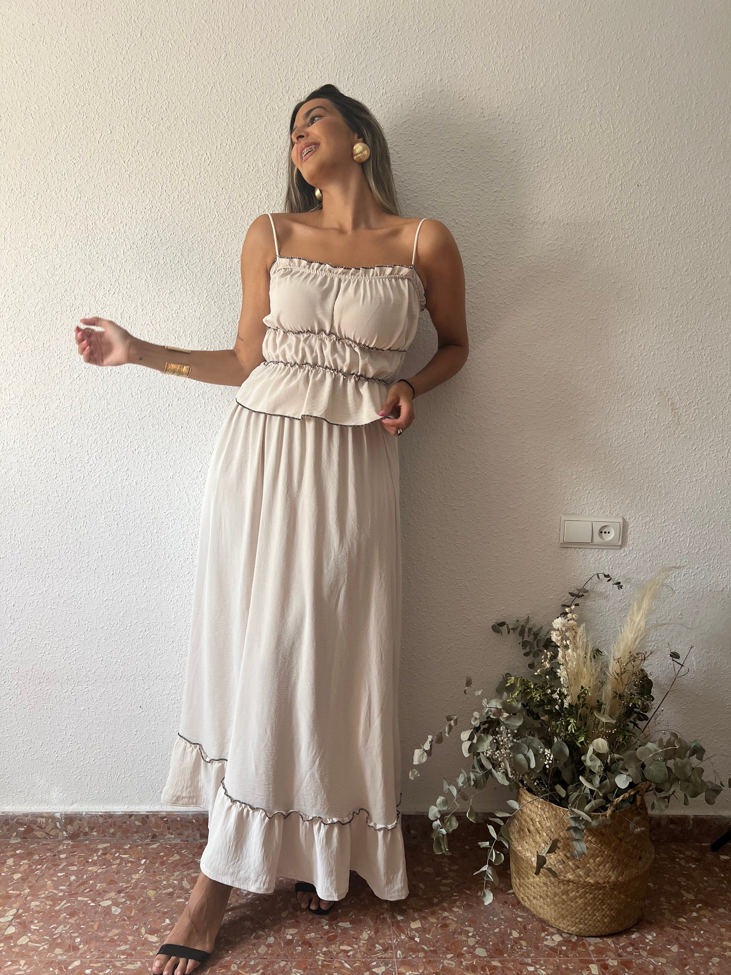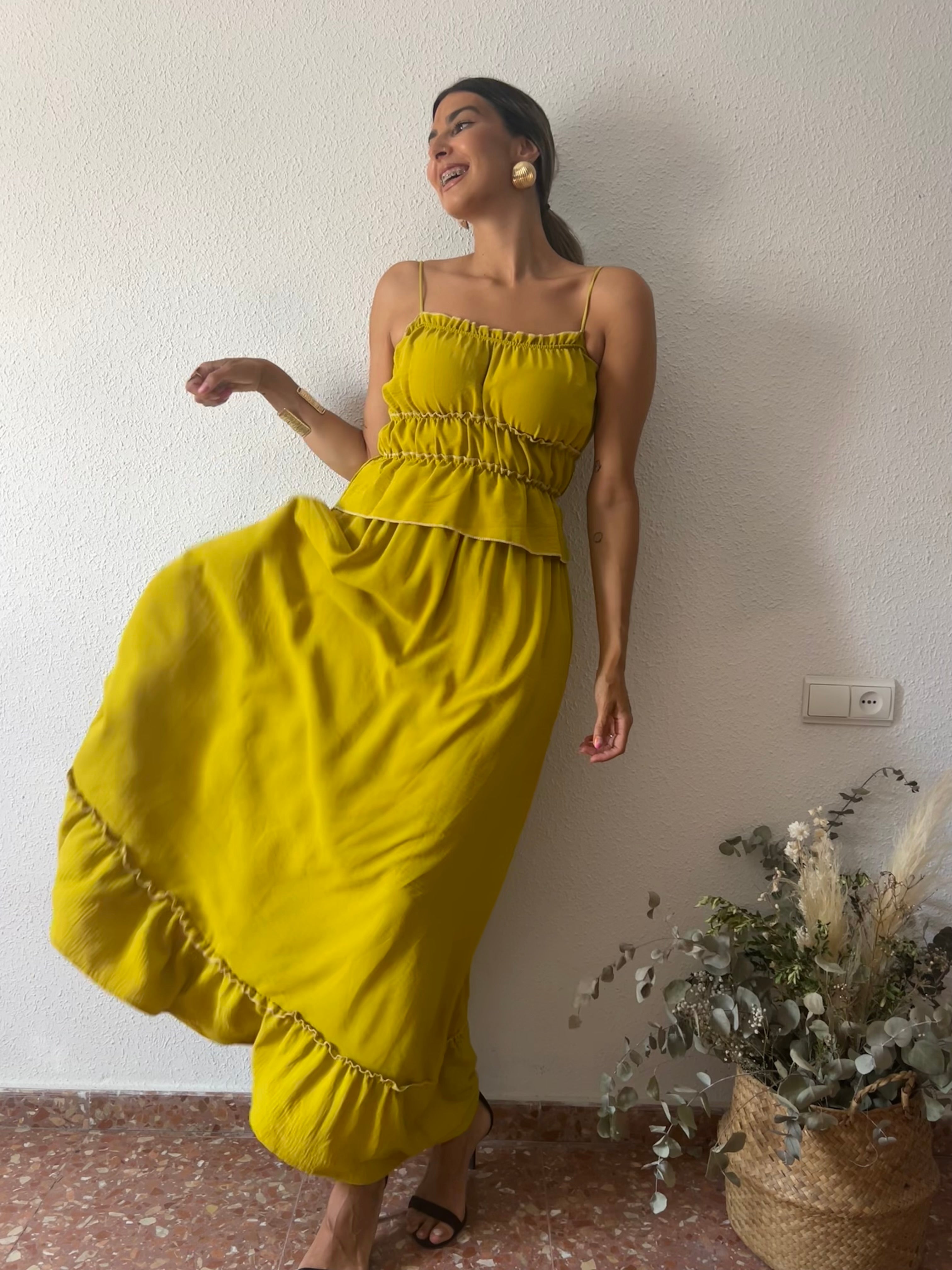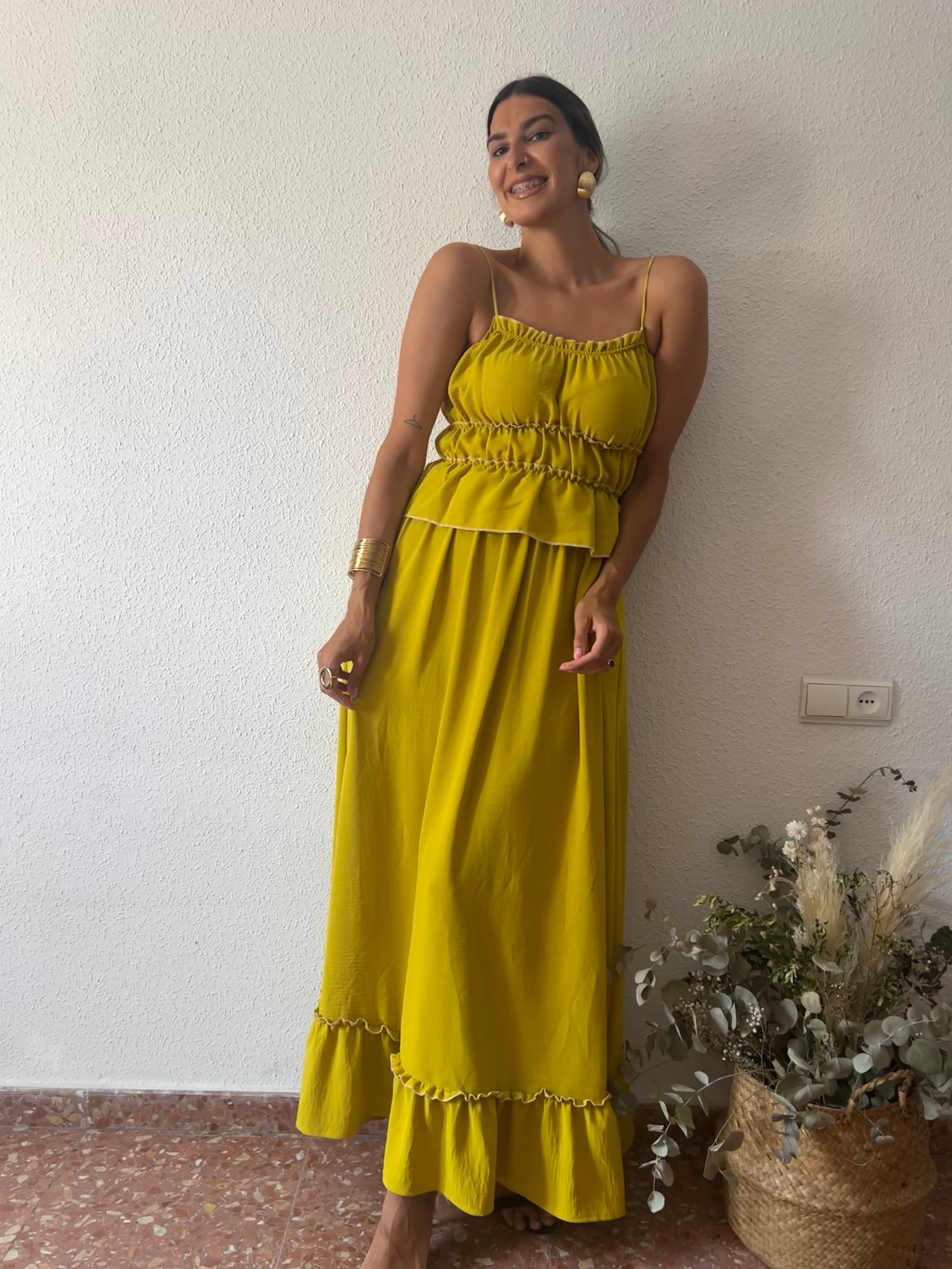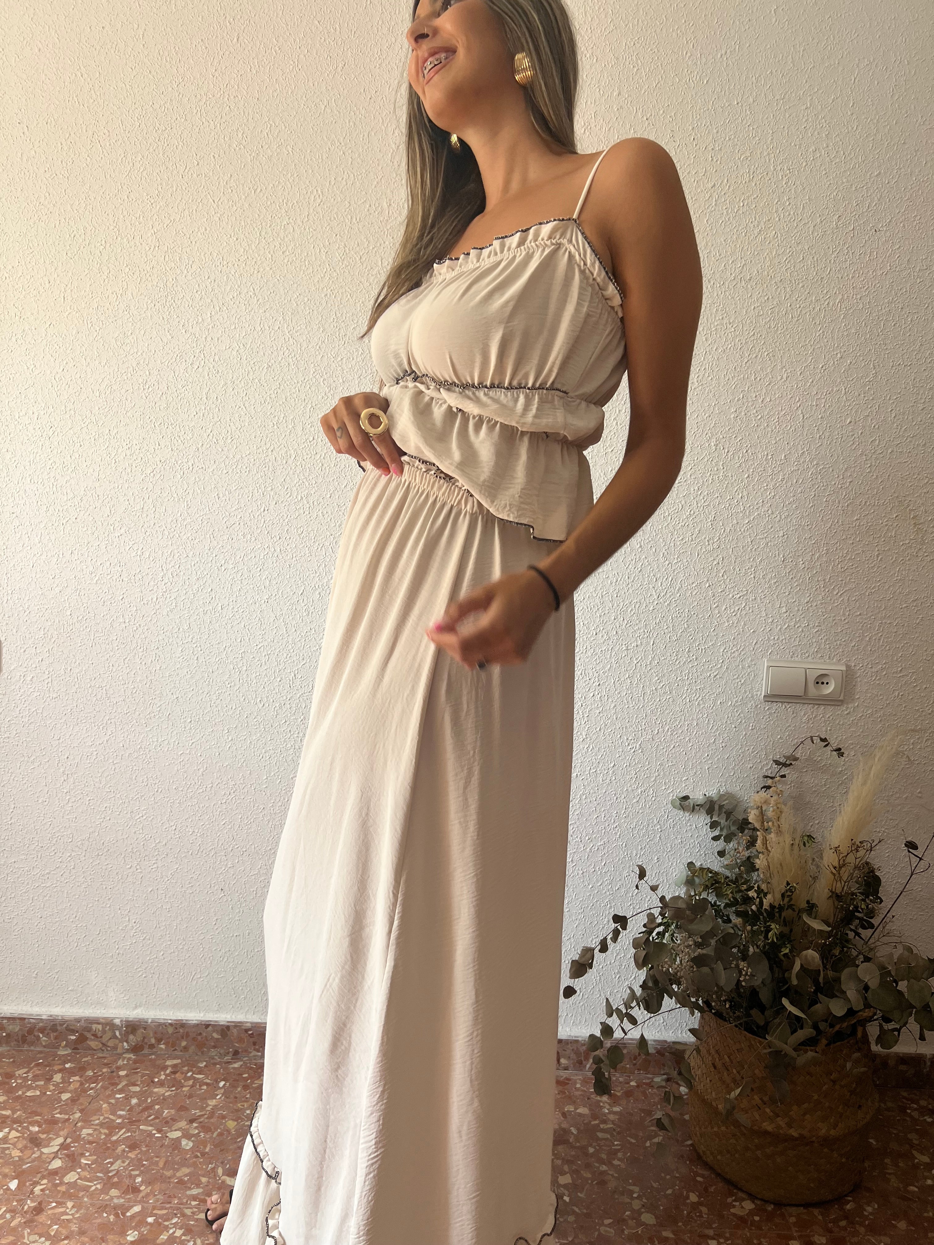 Conjunto compuesto por falda y top, tanto la falda como el top tienen mucho elástico y dan mucha talla. Los tirantes del top son elásticos.