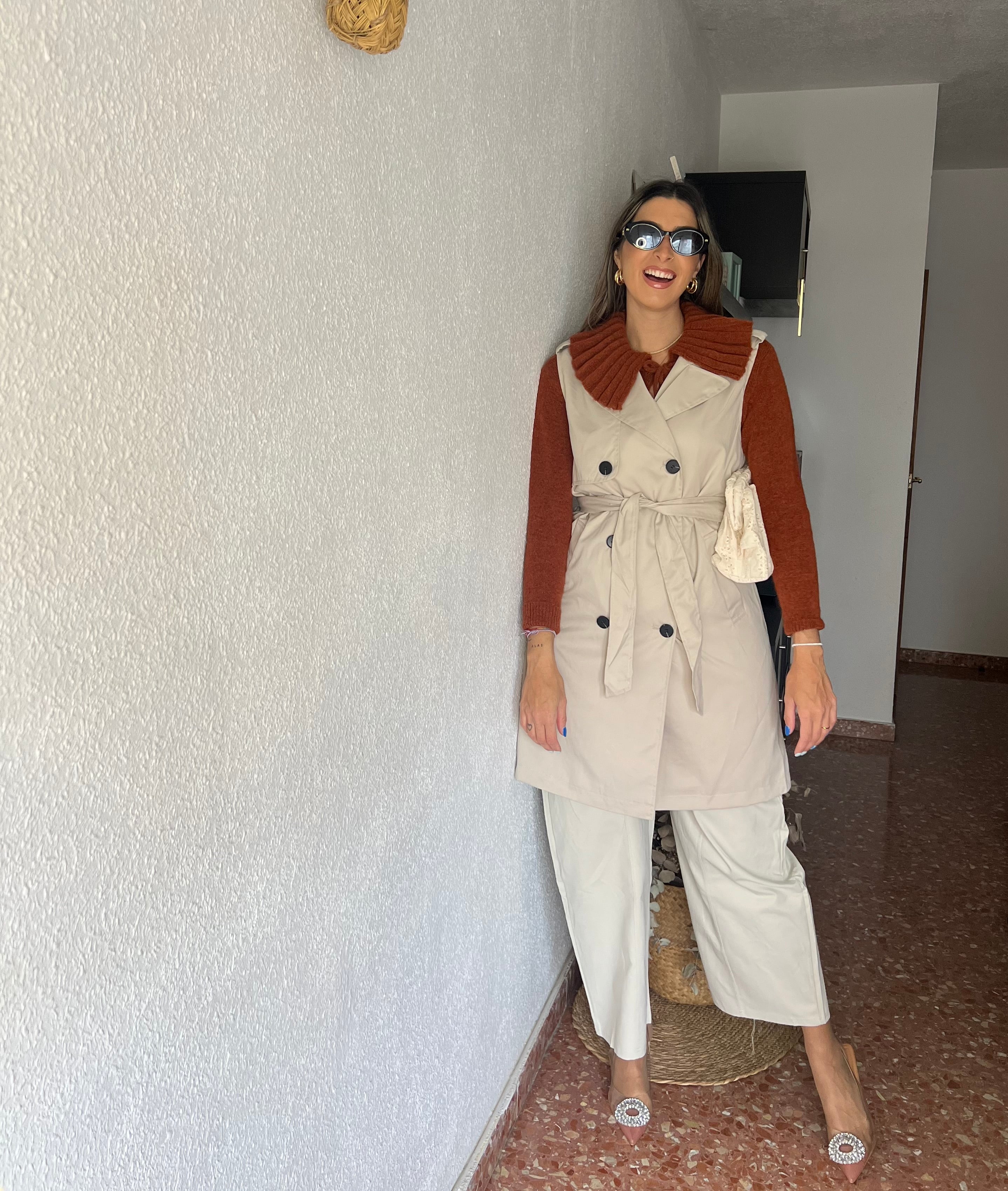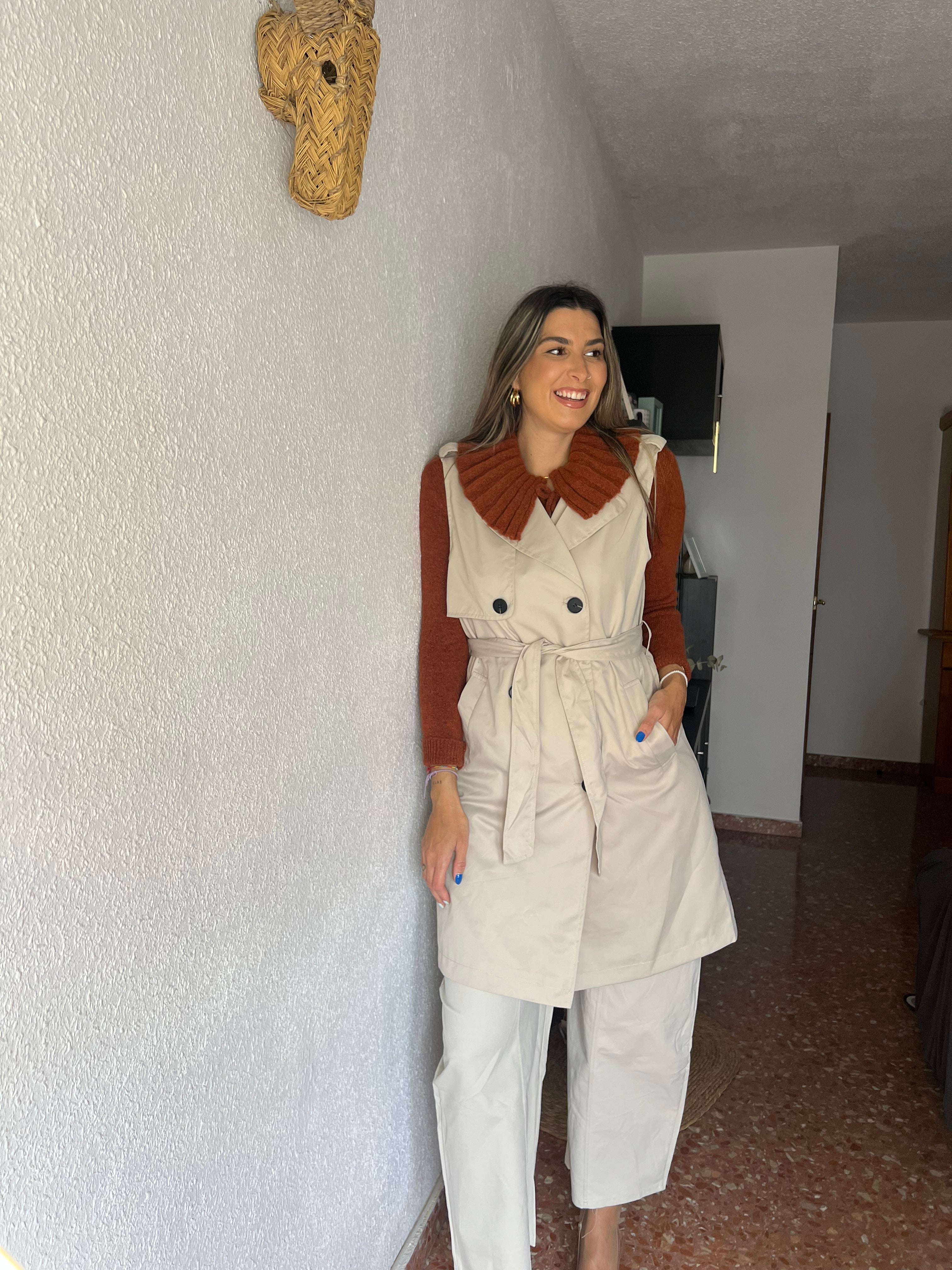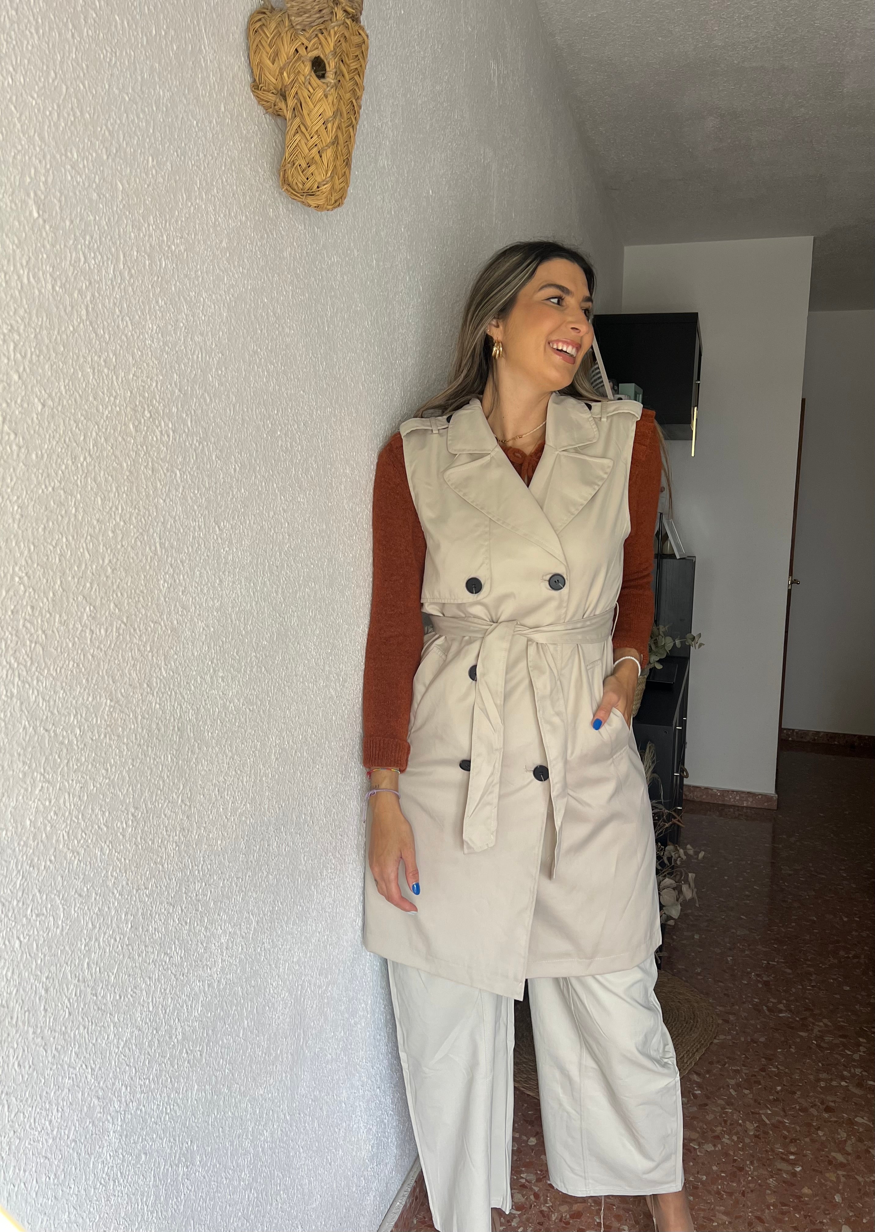 Chaleco tipo trench, con cinturón incluido, tiene forro interior y una pequeña abertura atrás.