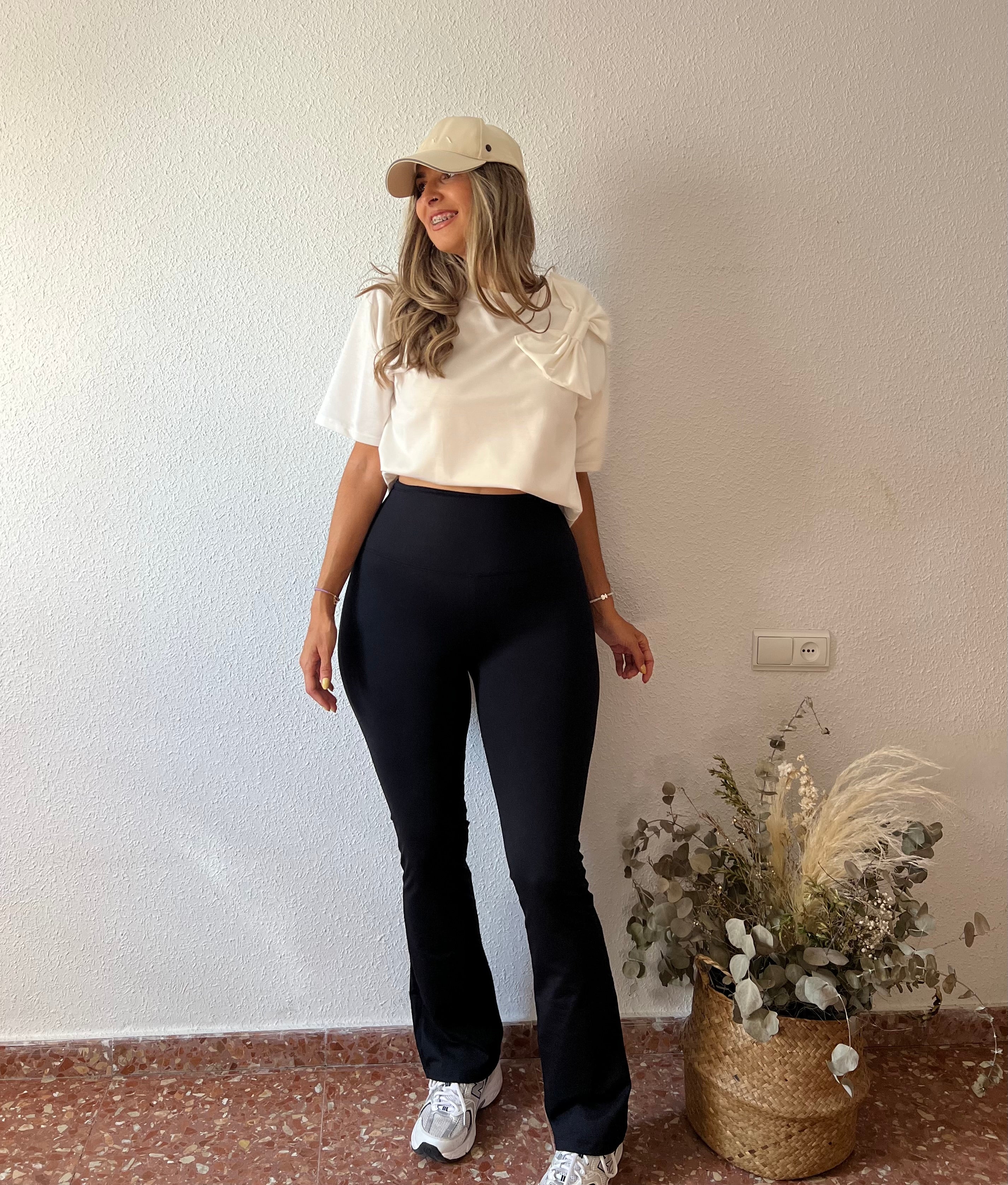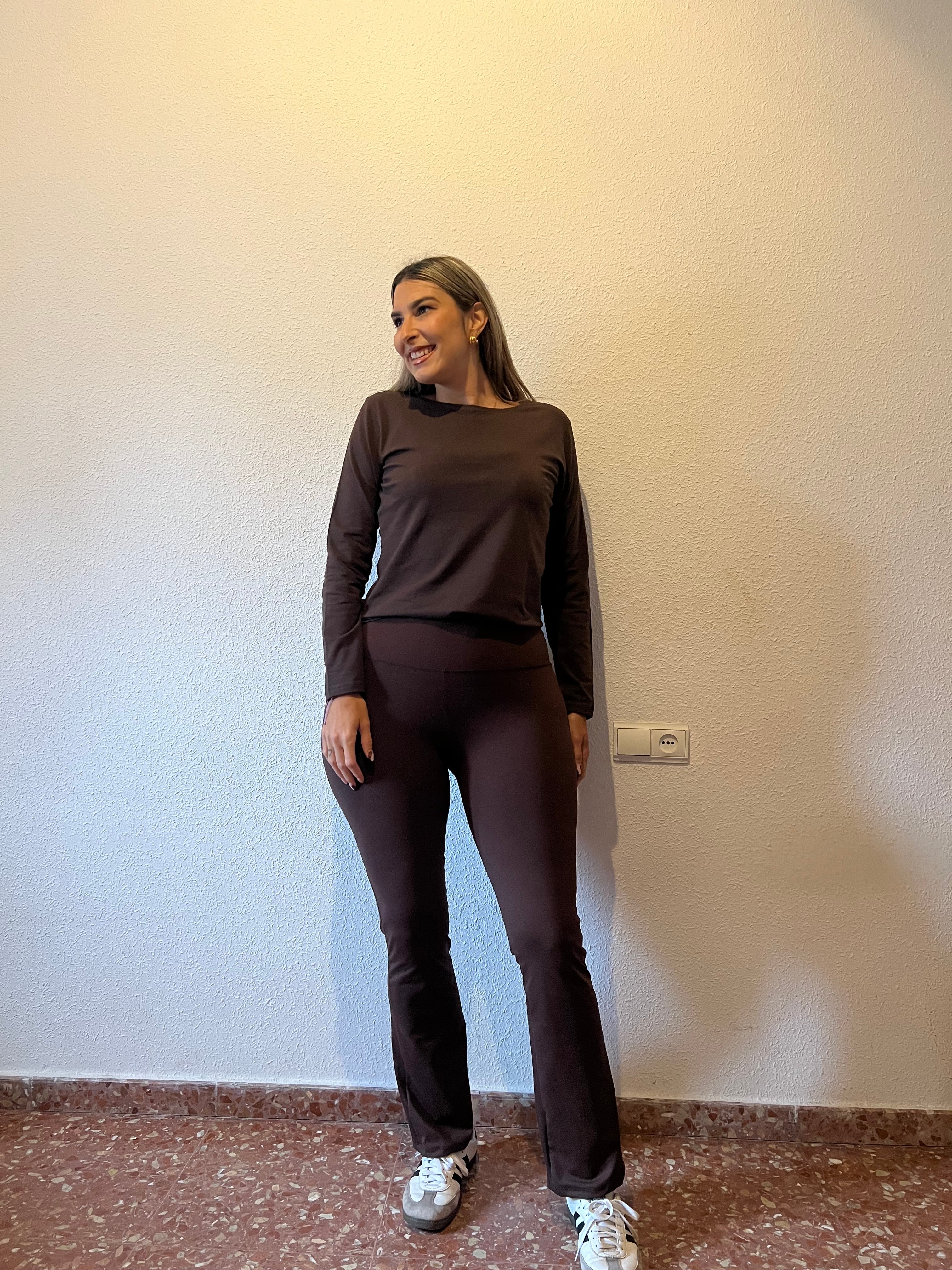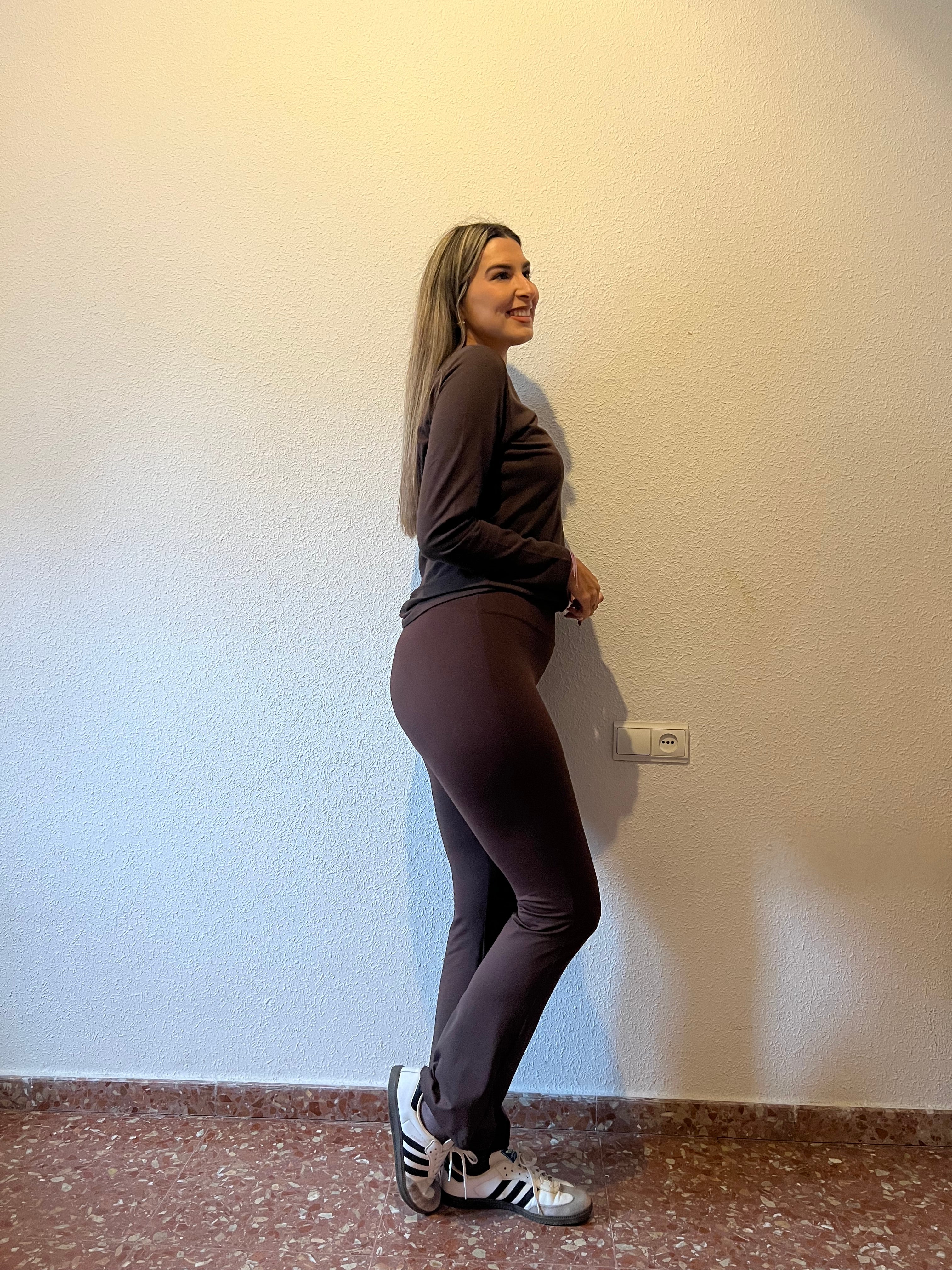 La modelo mide 174cm, usa talla 42 y lleva talla L.