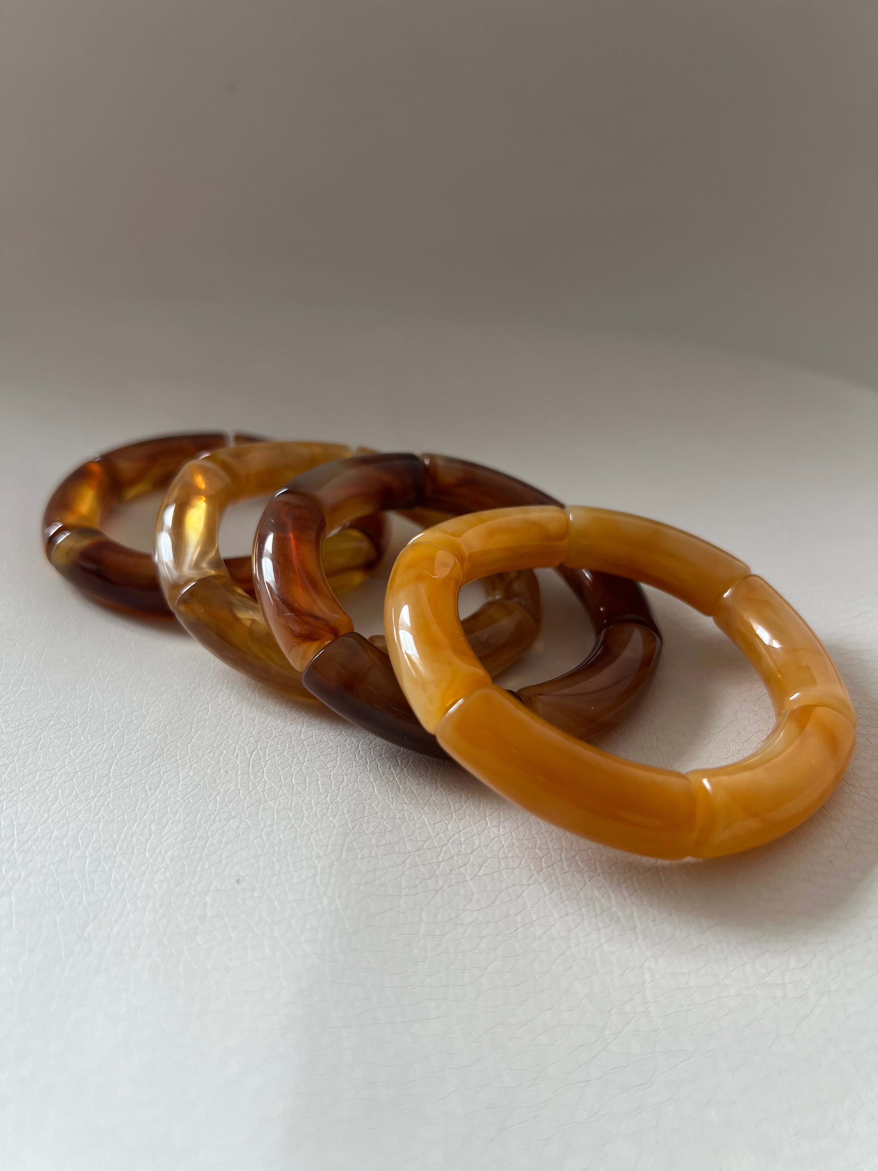 Pack de 4 pulseras de resina, en tonos marrones, son elásticas.