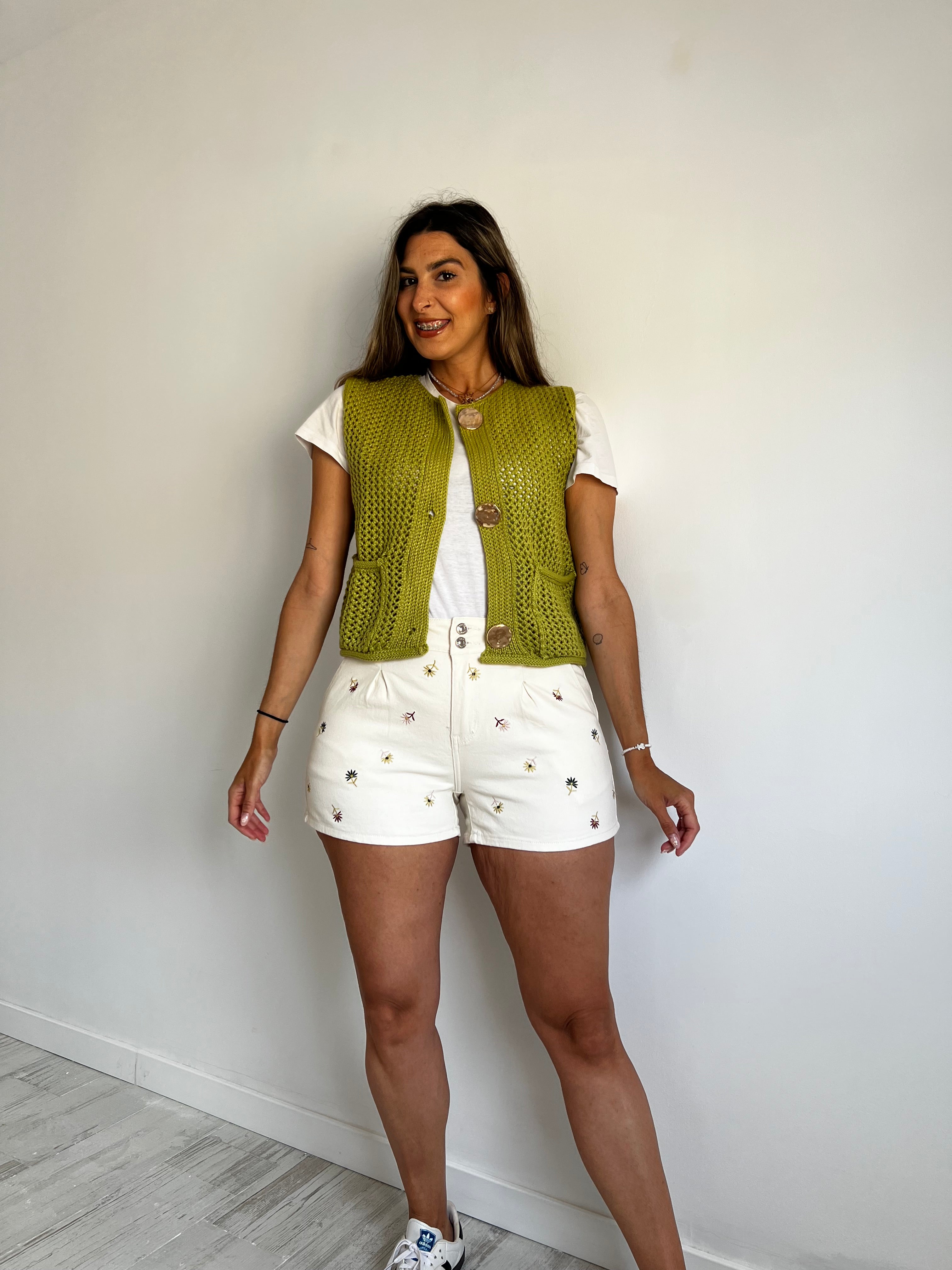 Bermuda vaquera con detalle de pinzas y completamente bordada la parte delantera.
