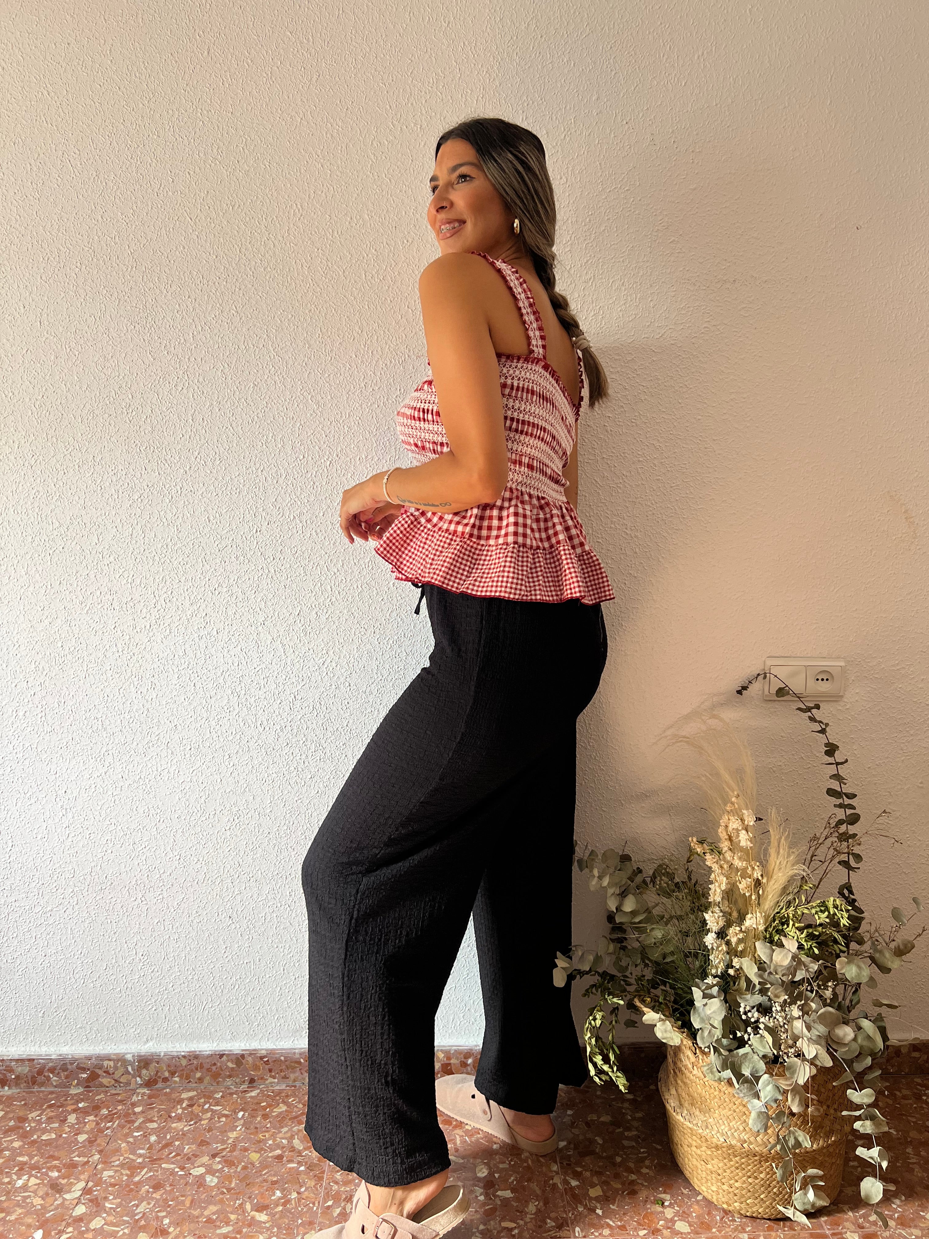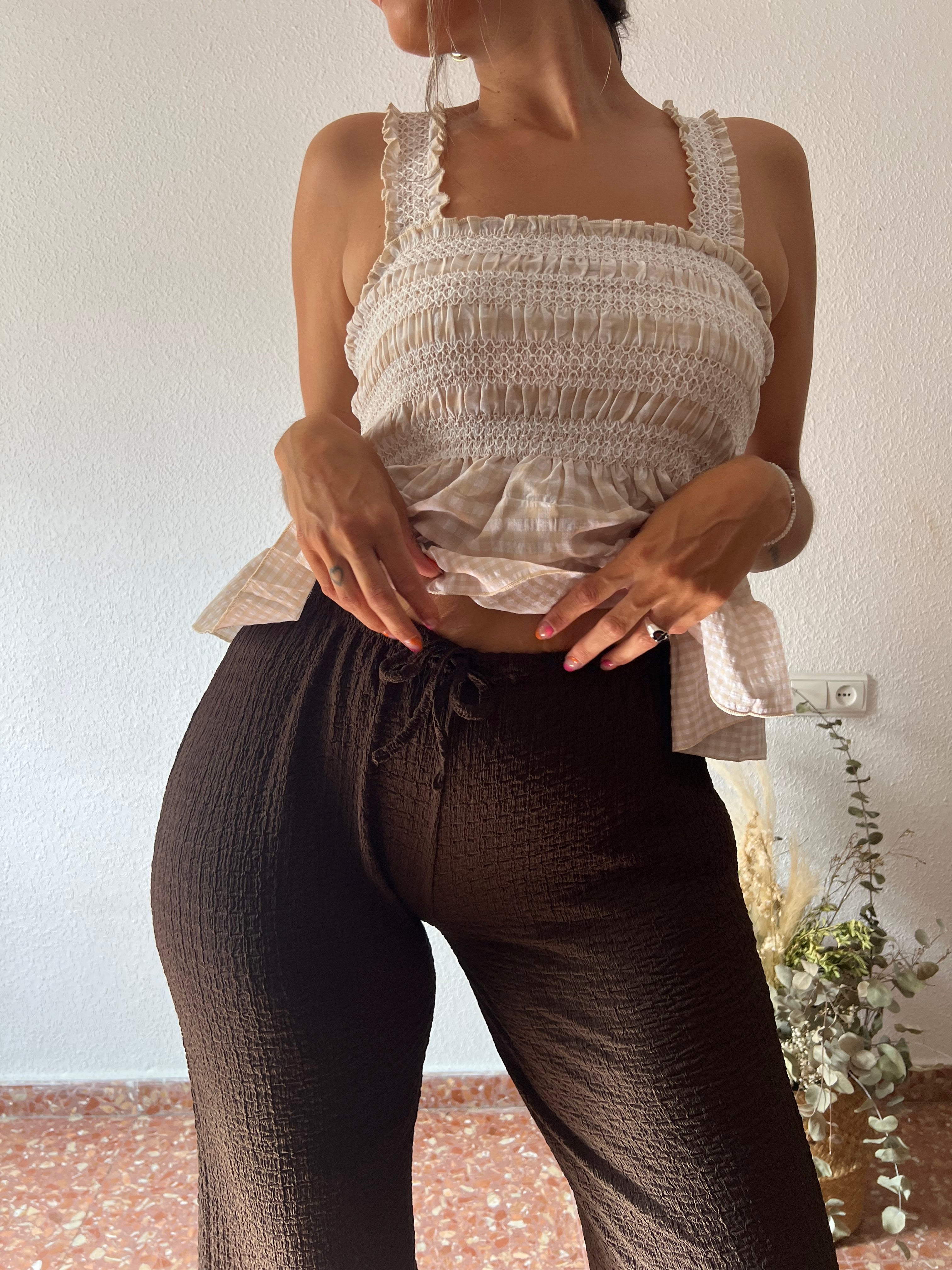 Pantalón fluido en tejido rústico. Cintura elástica, lazo de adorno. (Hasta una talla 44-46)
