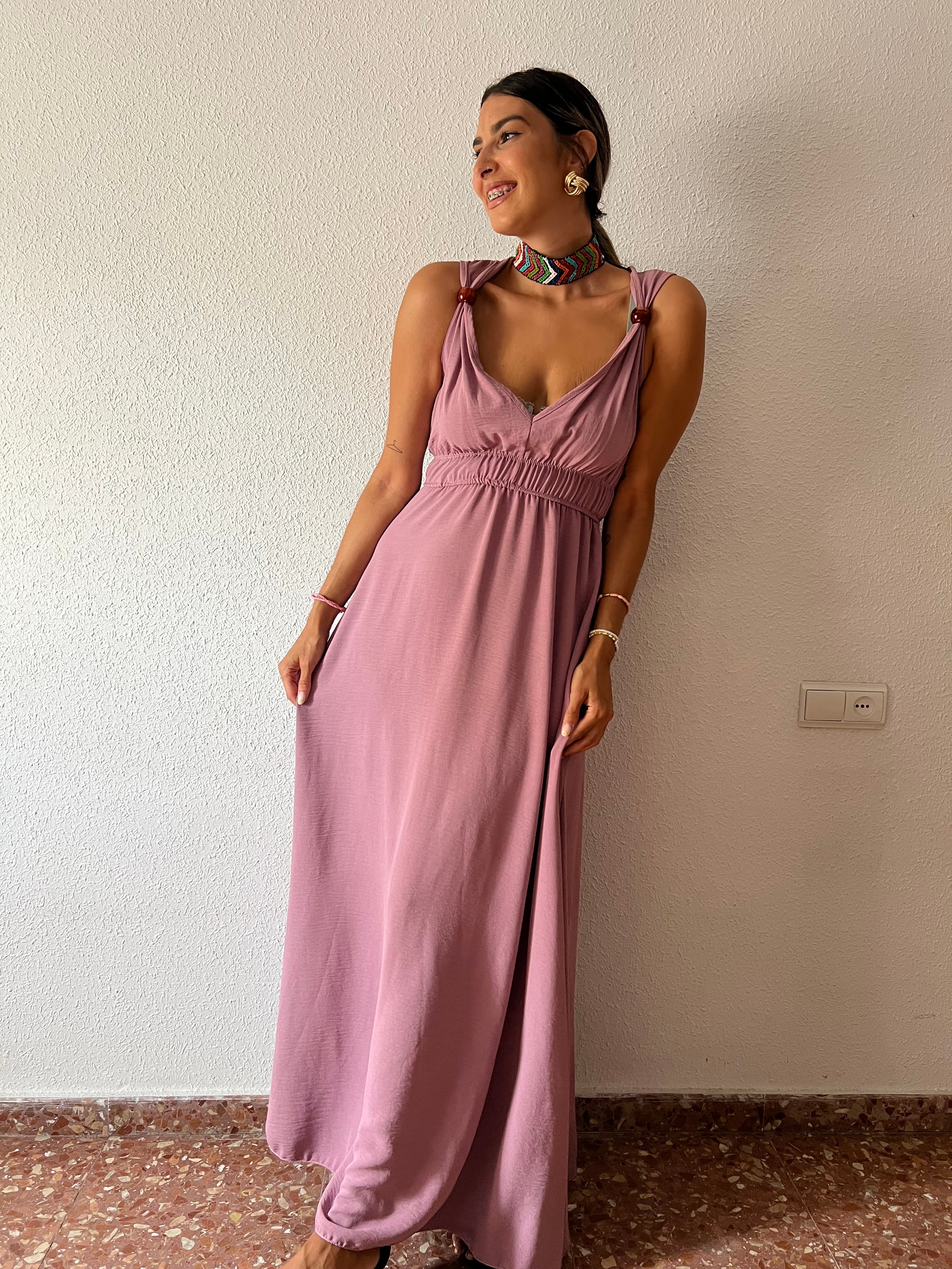 Vestido largo de corte fluido, con detalle de elásticos en la cintura, y abalorio en los tirantes.