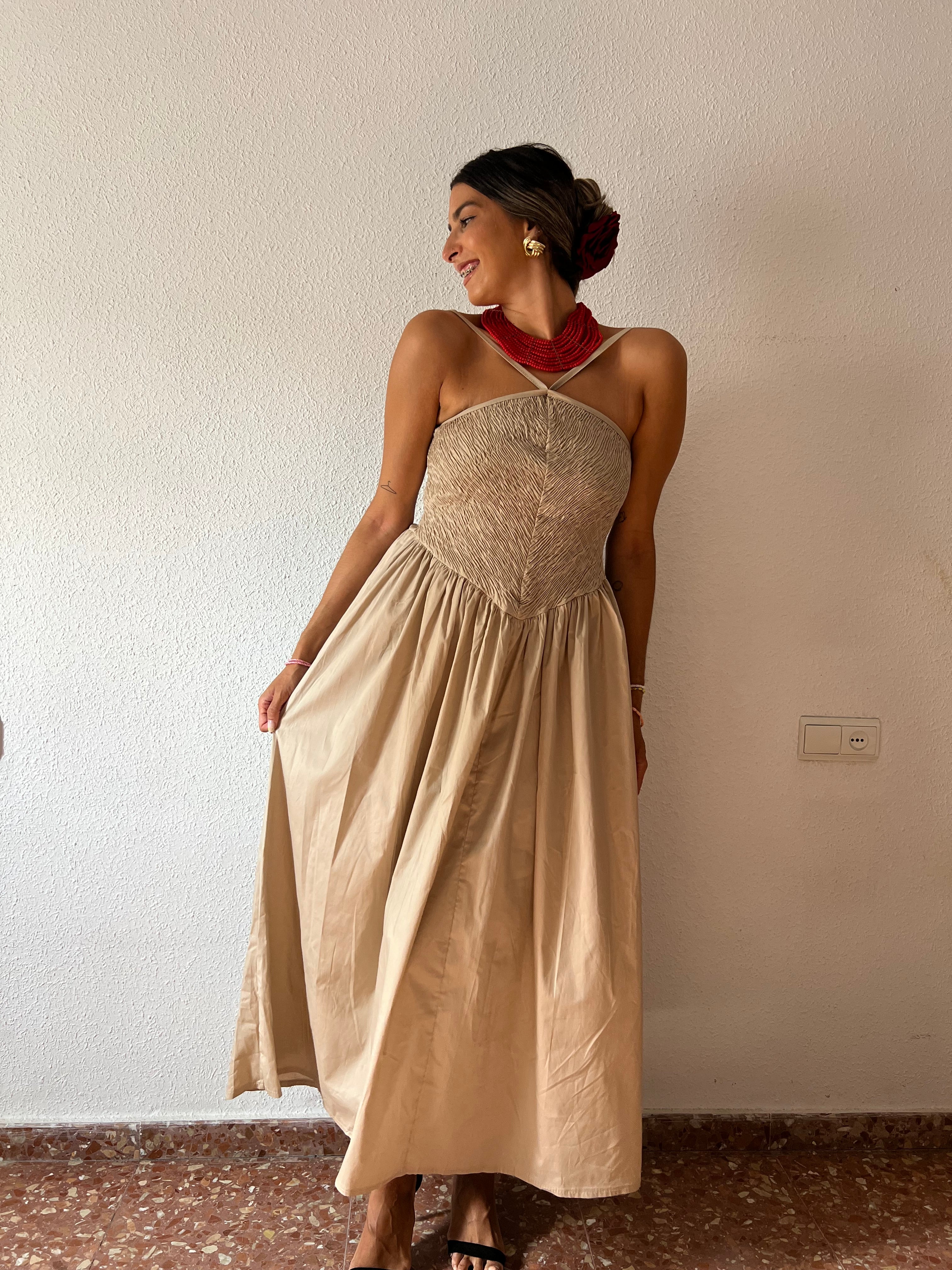 Vestido de corte midi con detalle de panel de abeja y volumen en la cintura.