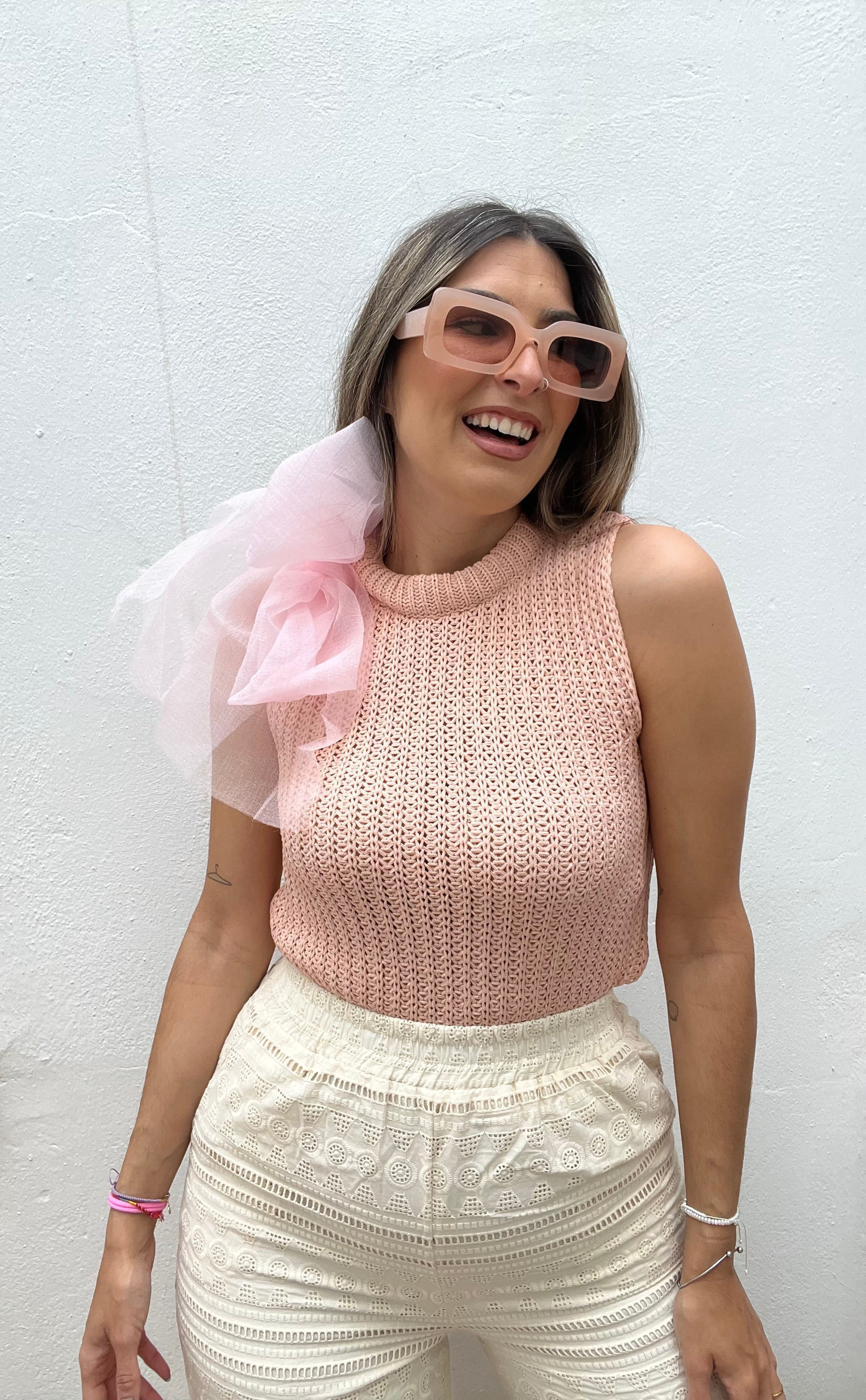 Chaleco de punto sin mangas con detalle de lazo de organza en el cuello.