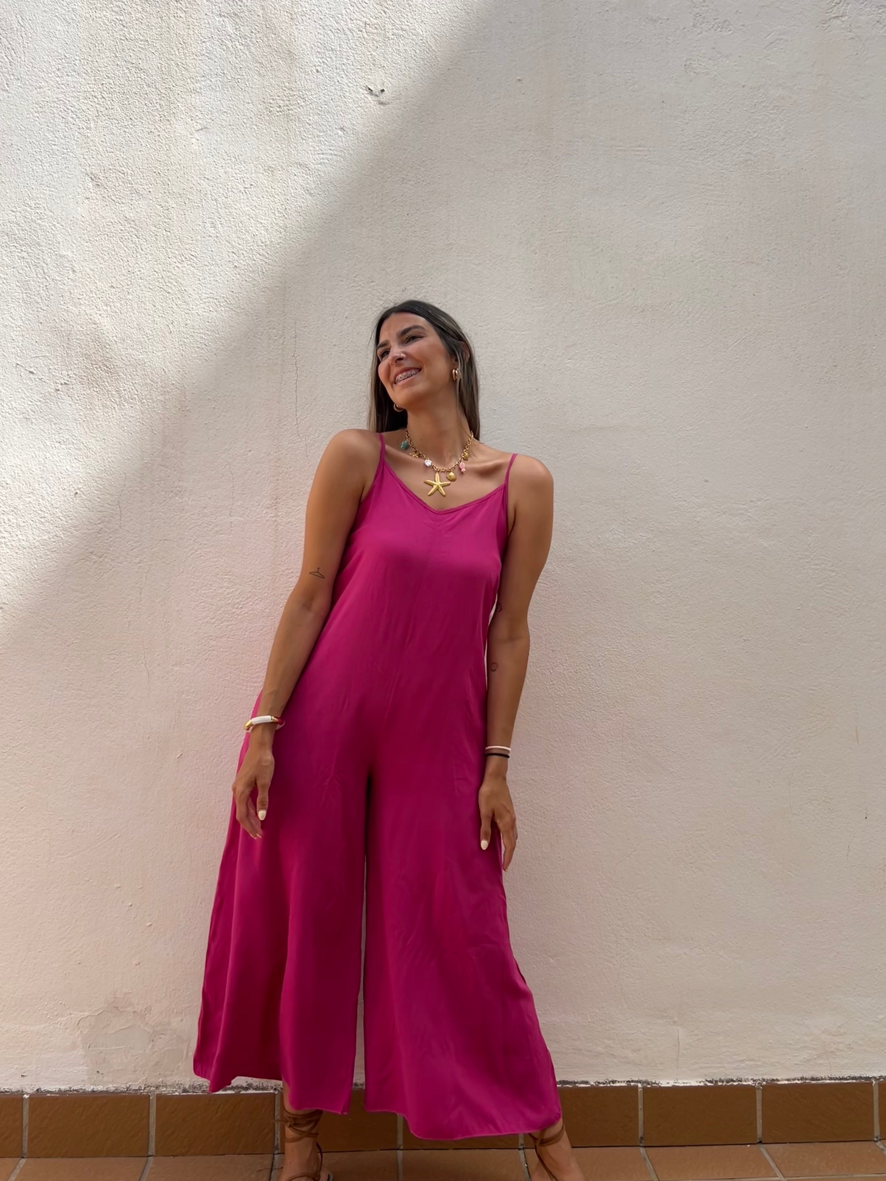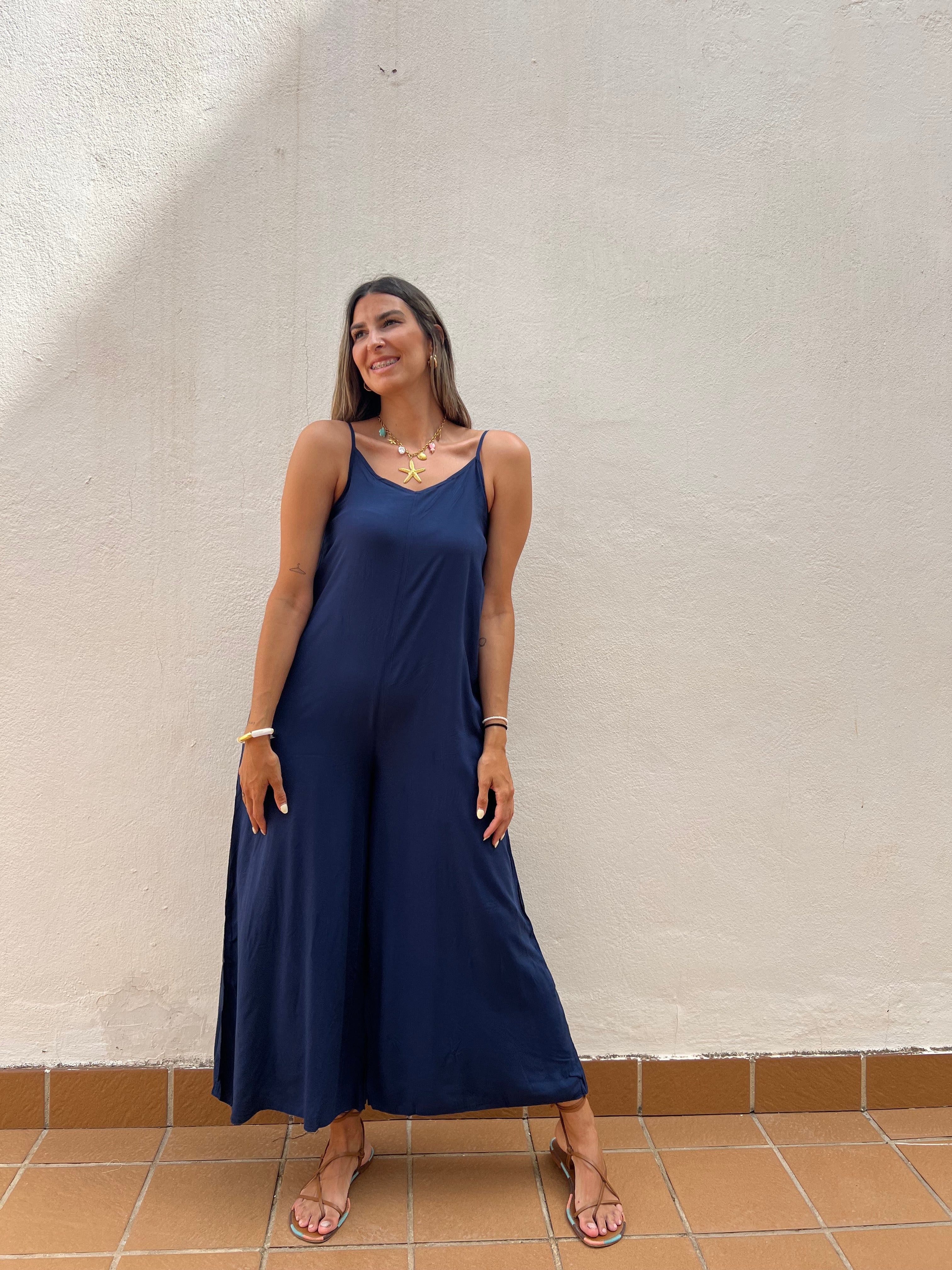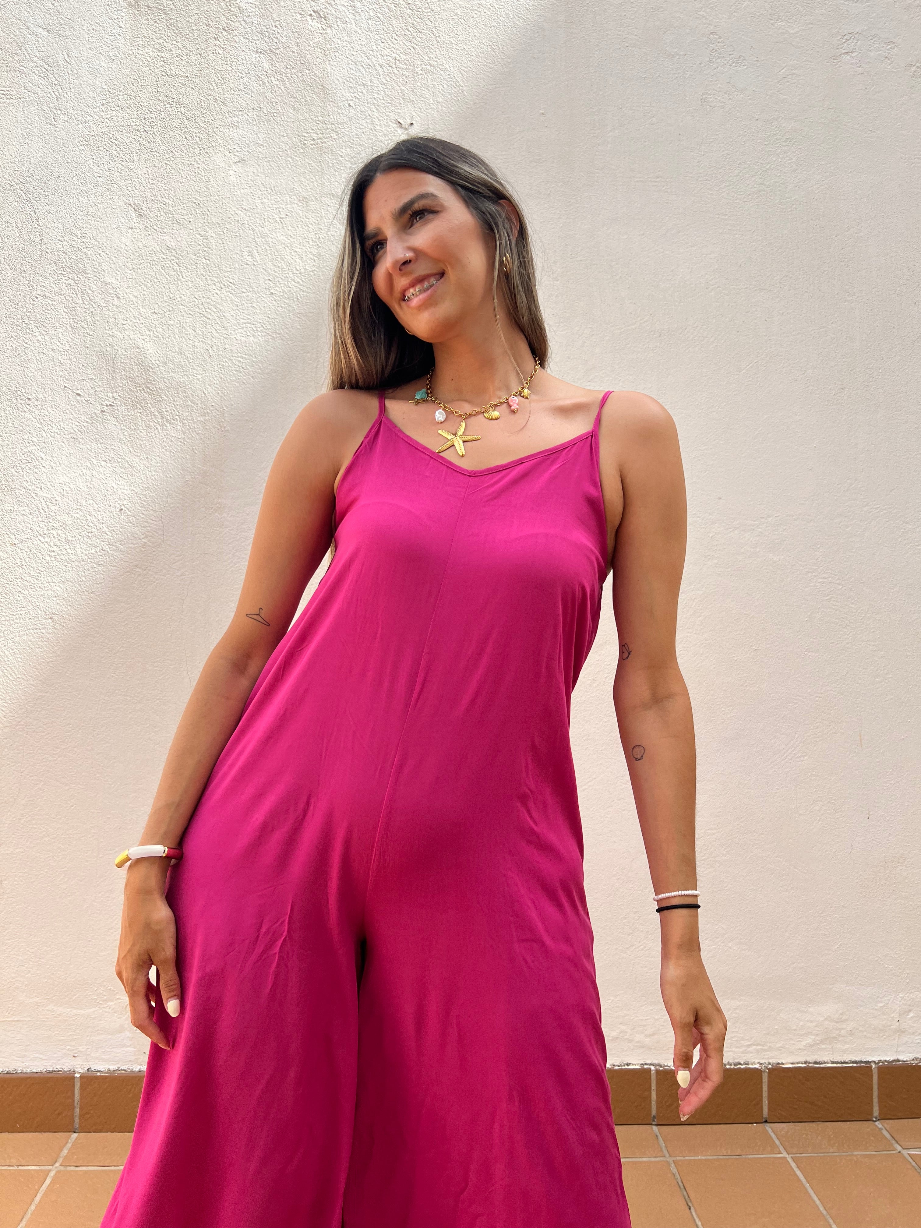 Mono básico de corte fluido con detalle de tirantes regulables y elástico en la espalda.