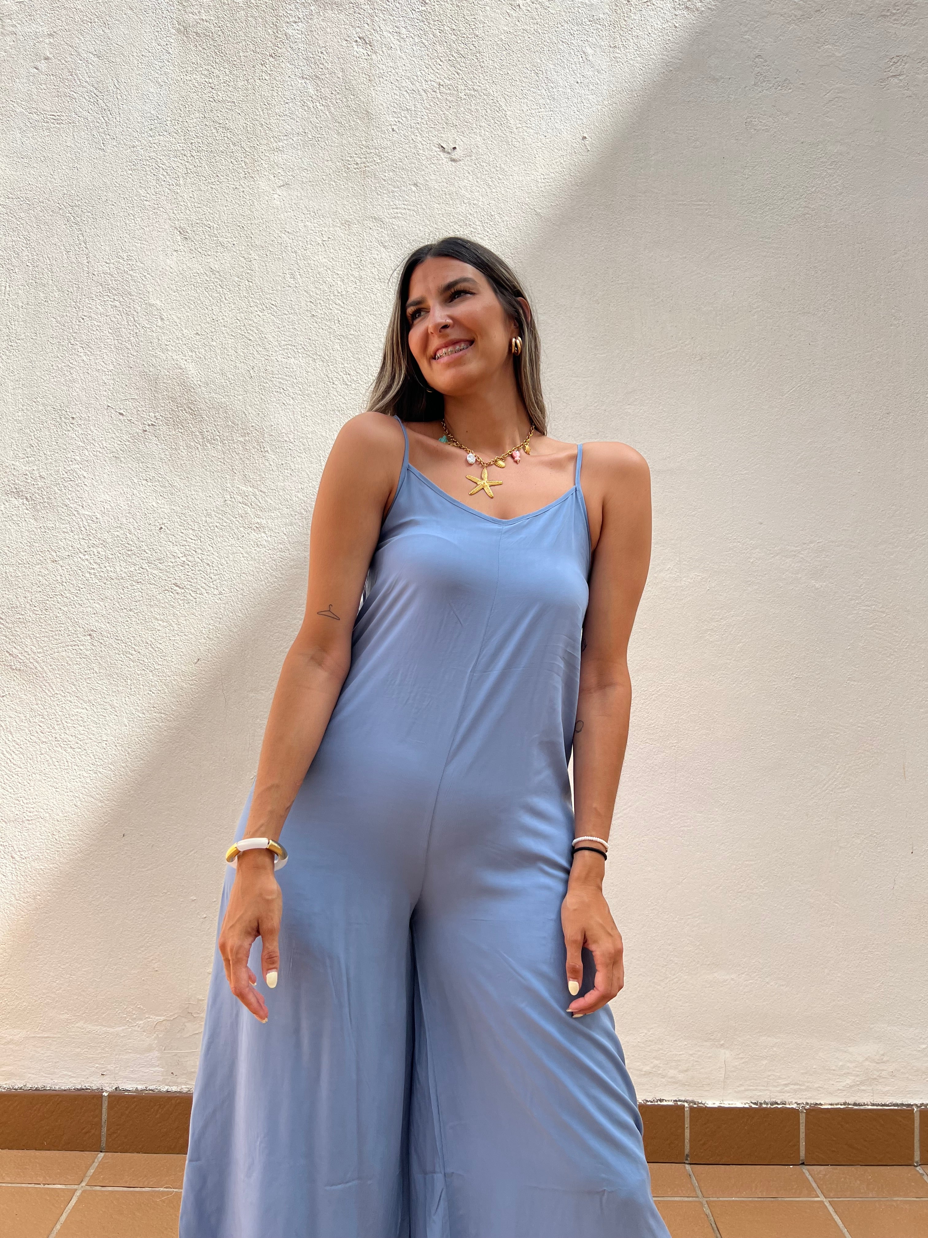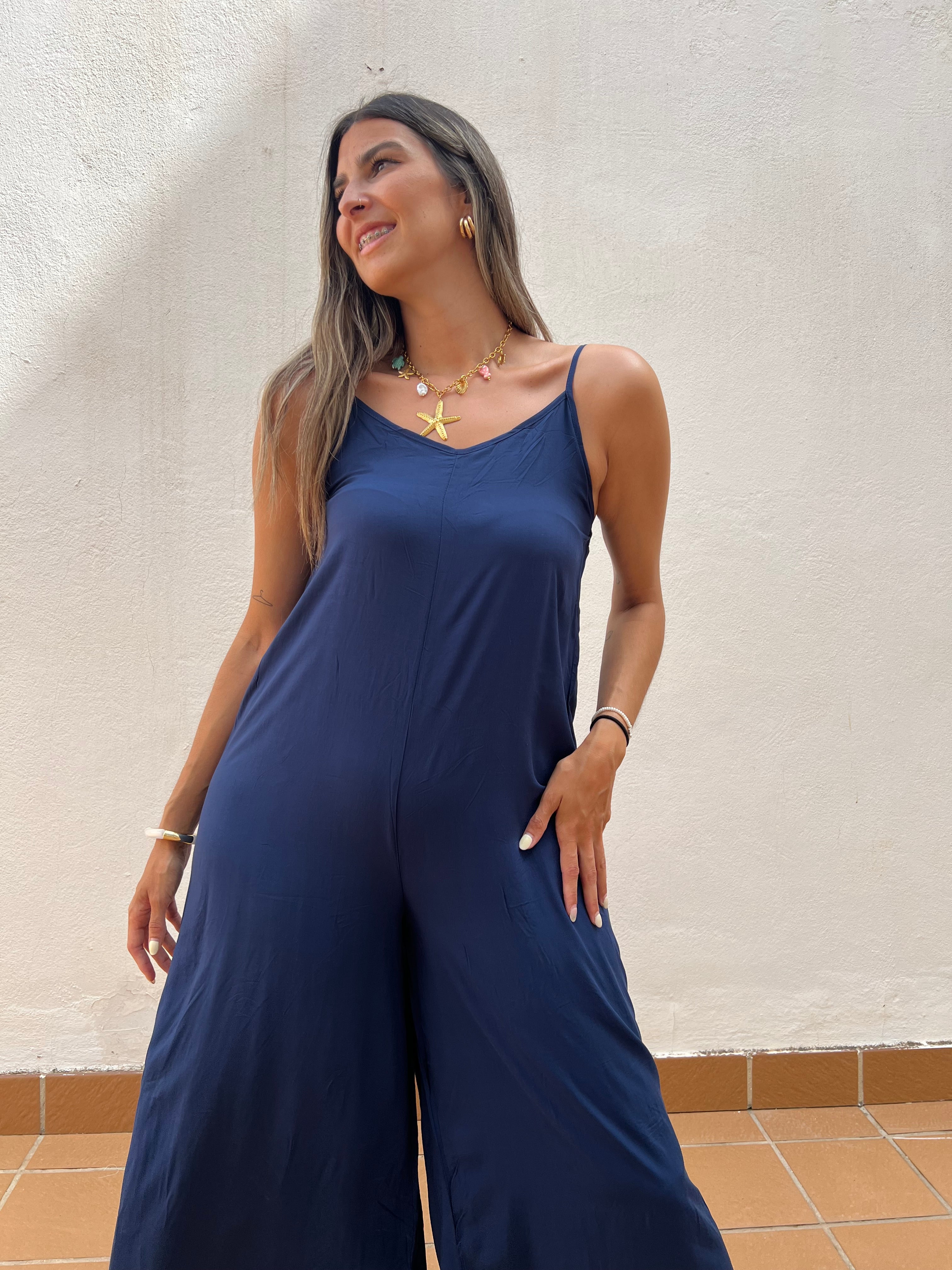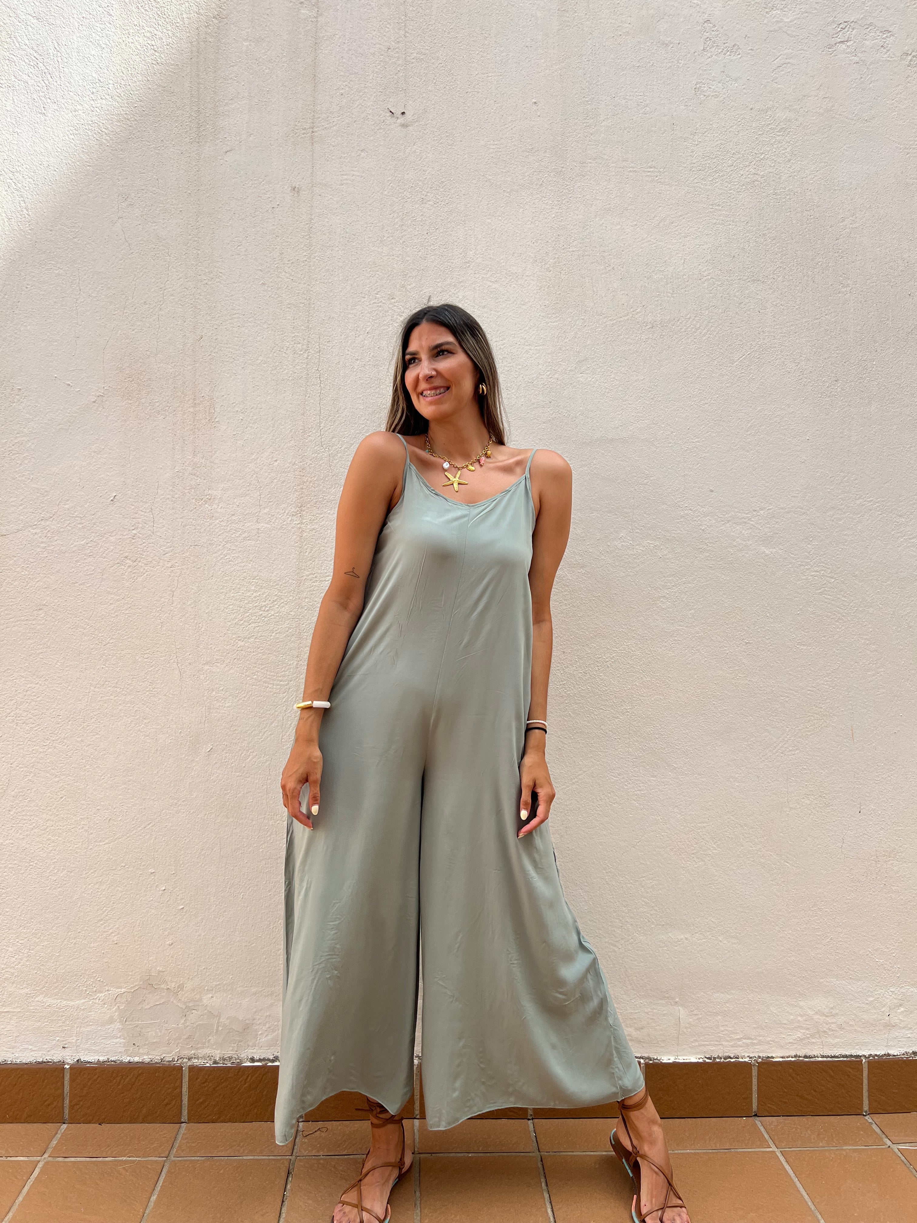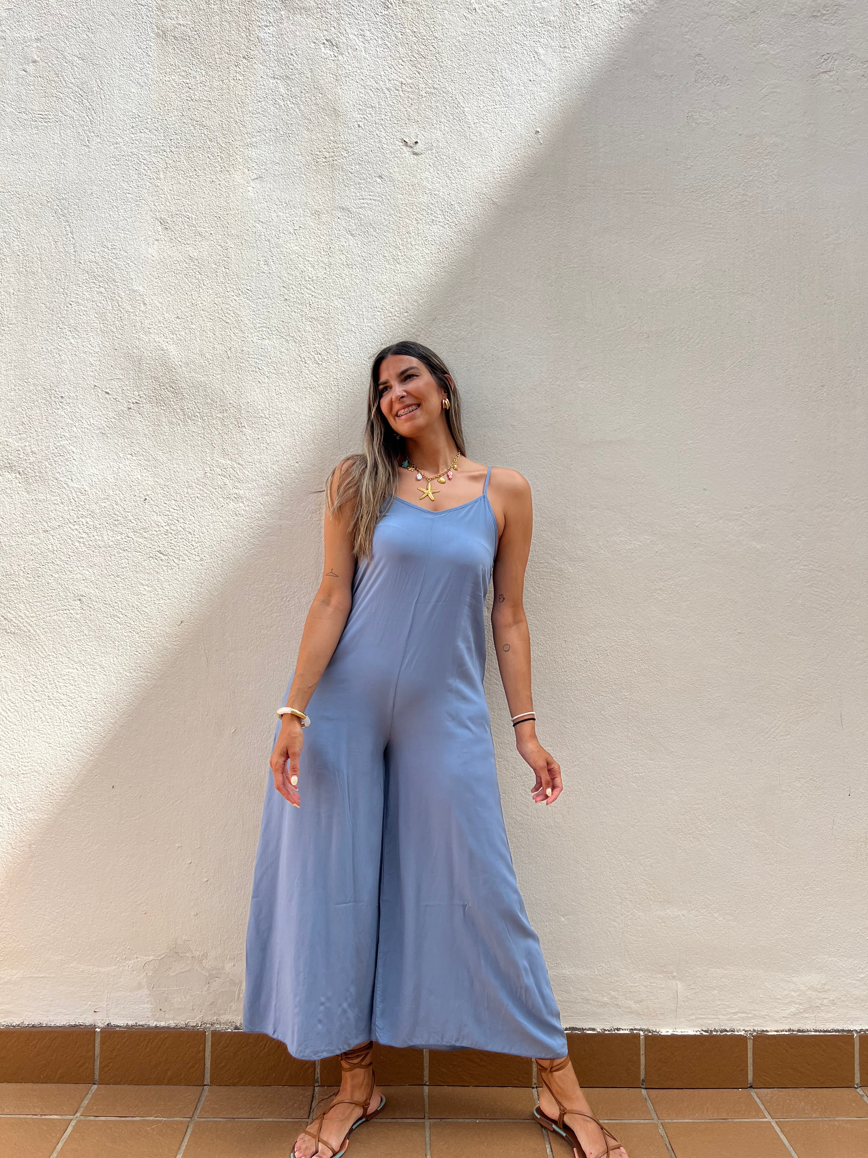 Mono básico de corte fluido con detalle de tirantes regulables y elástico en la espalda.