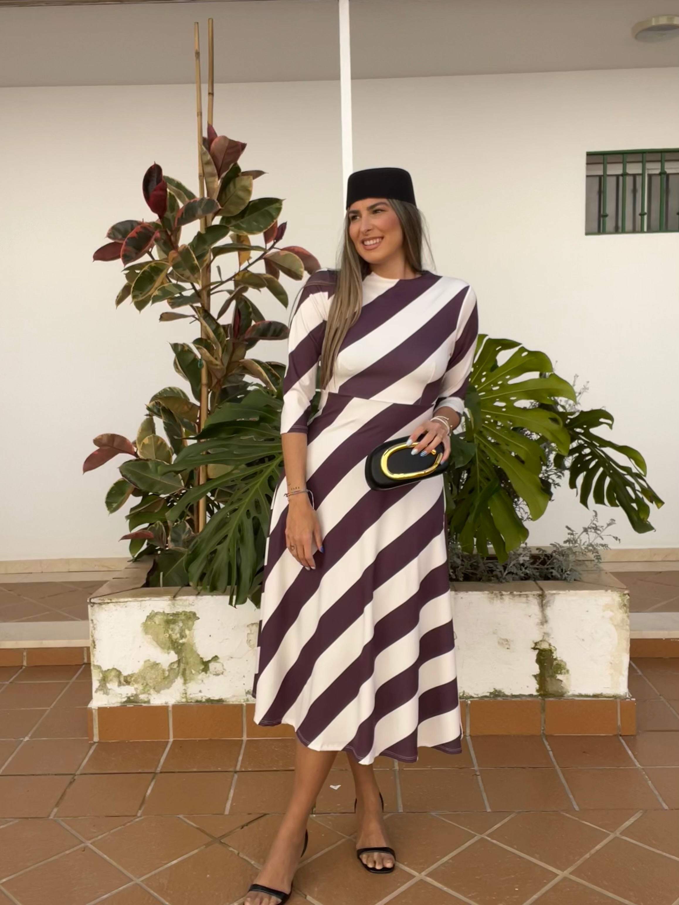 Vestido de corte midi estampado de rayas asimétricas, tiene manga 3/4 y bastante elástico.
