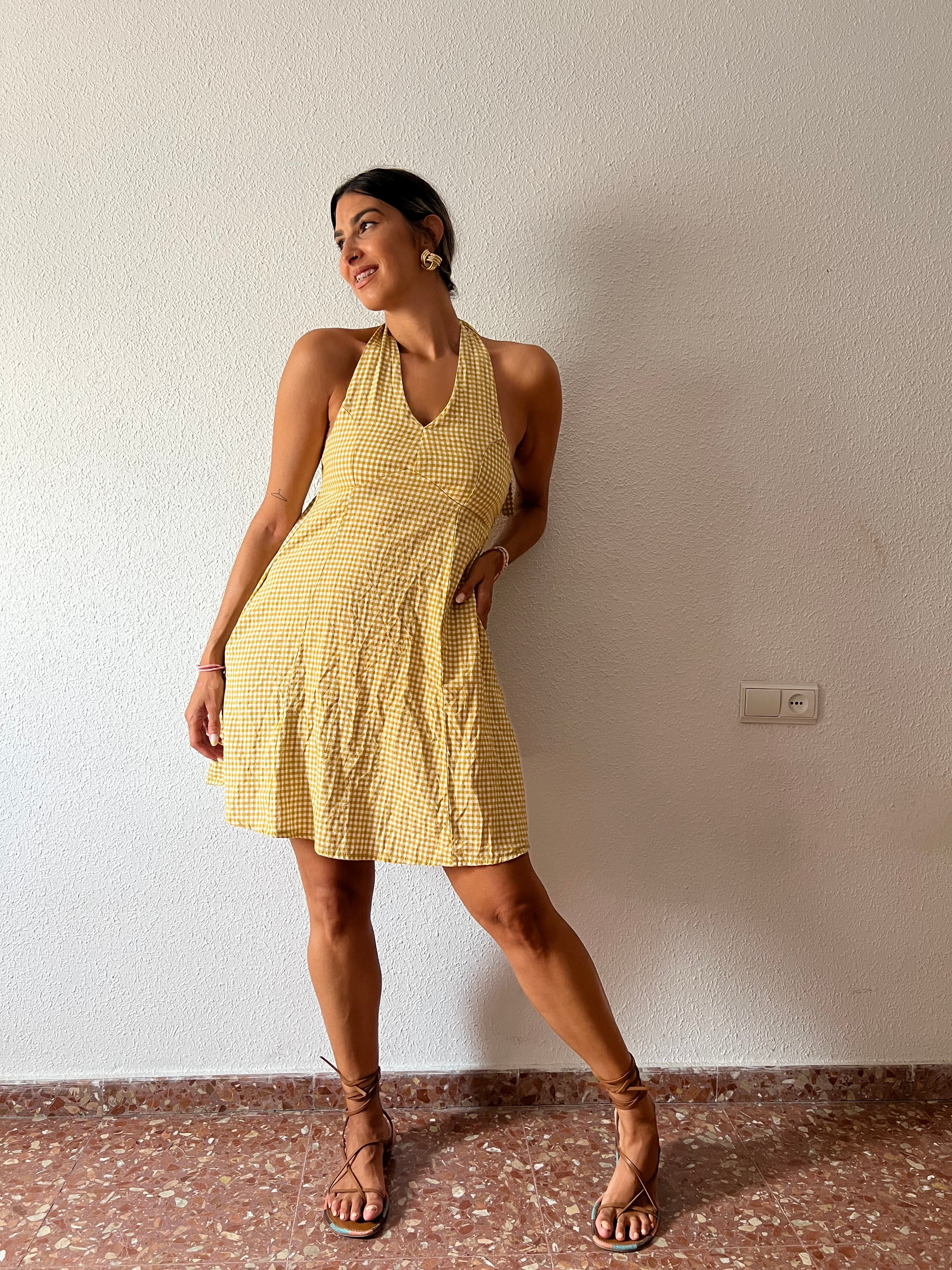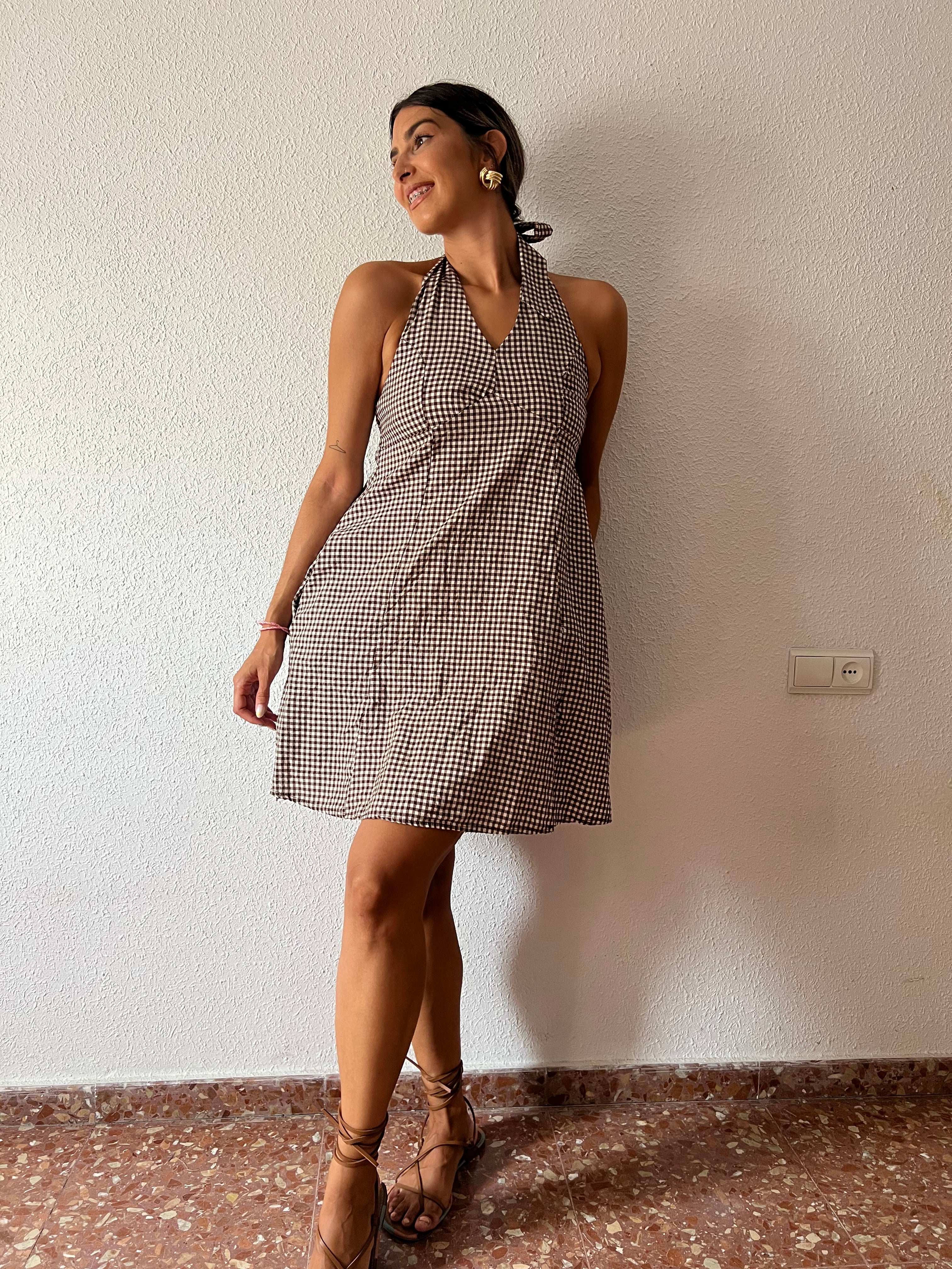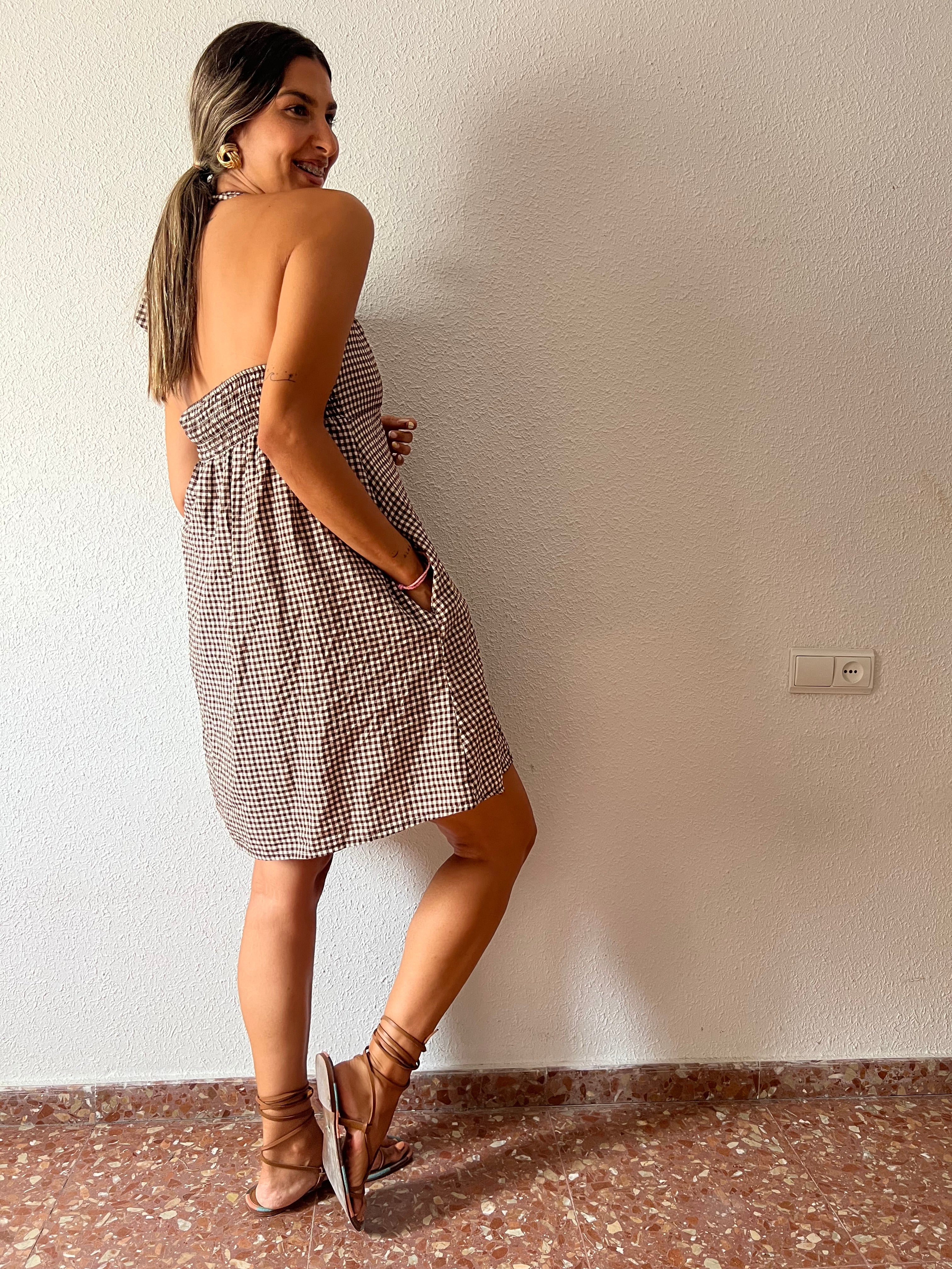 Vestido corto de estampado vichy, escote halter, nido de abeja en la espalda y bolsillos en los laterales.