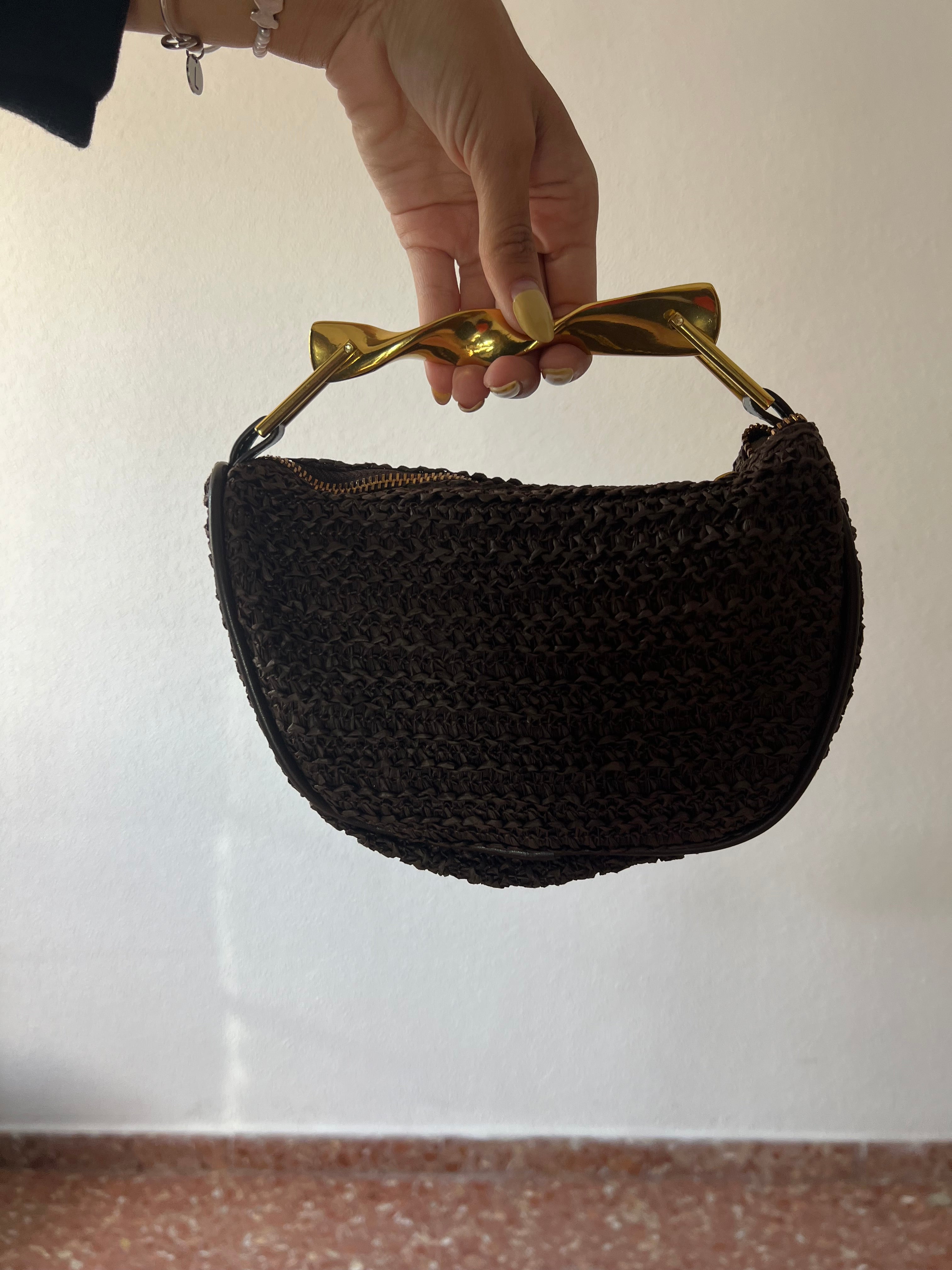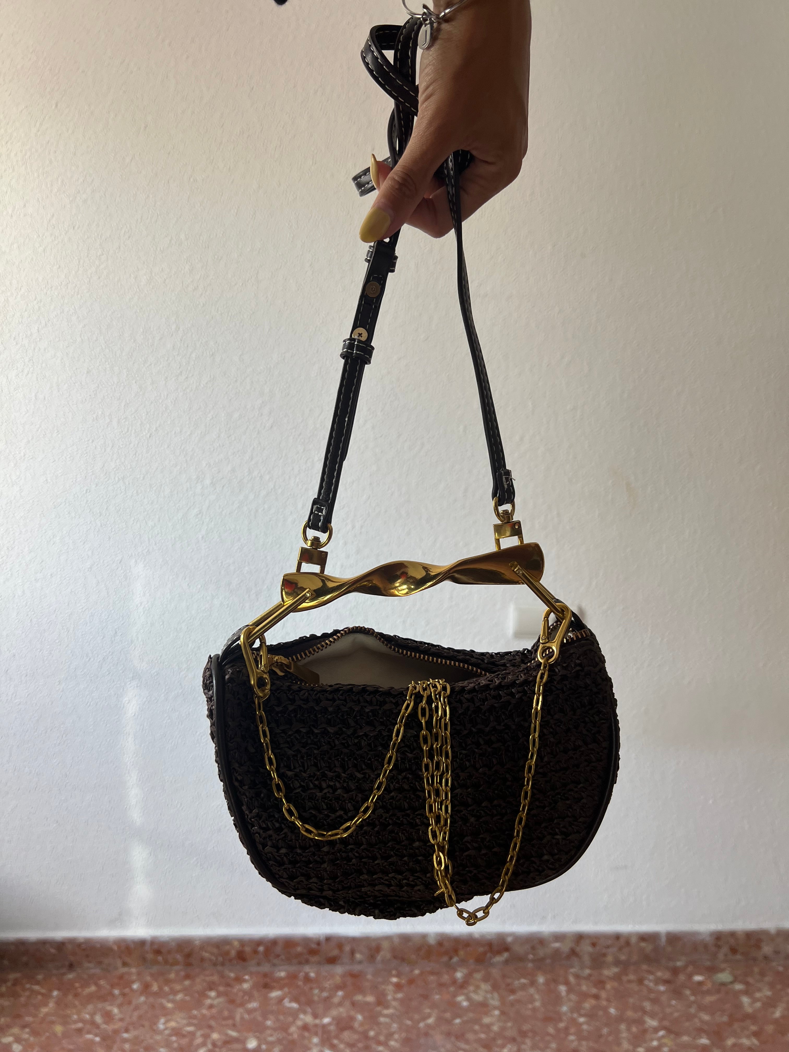 Bolso mini en tejido trenzado con detalle de asa metálica, incluye 2 asas bandoleras.