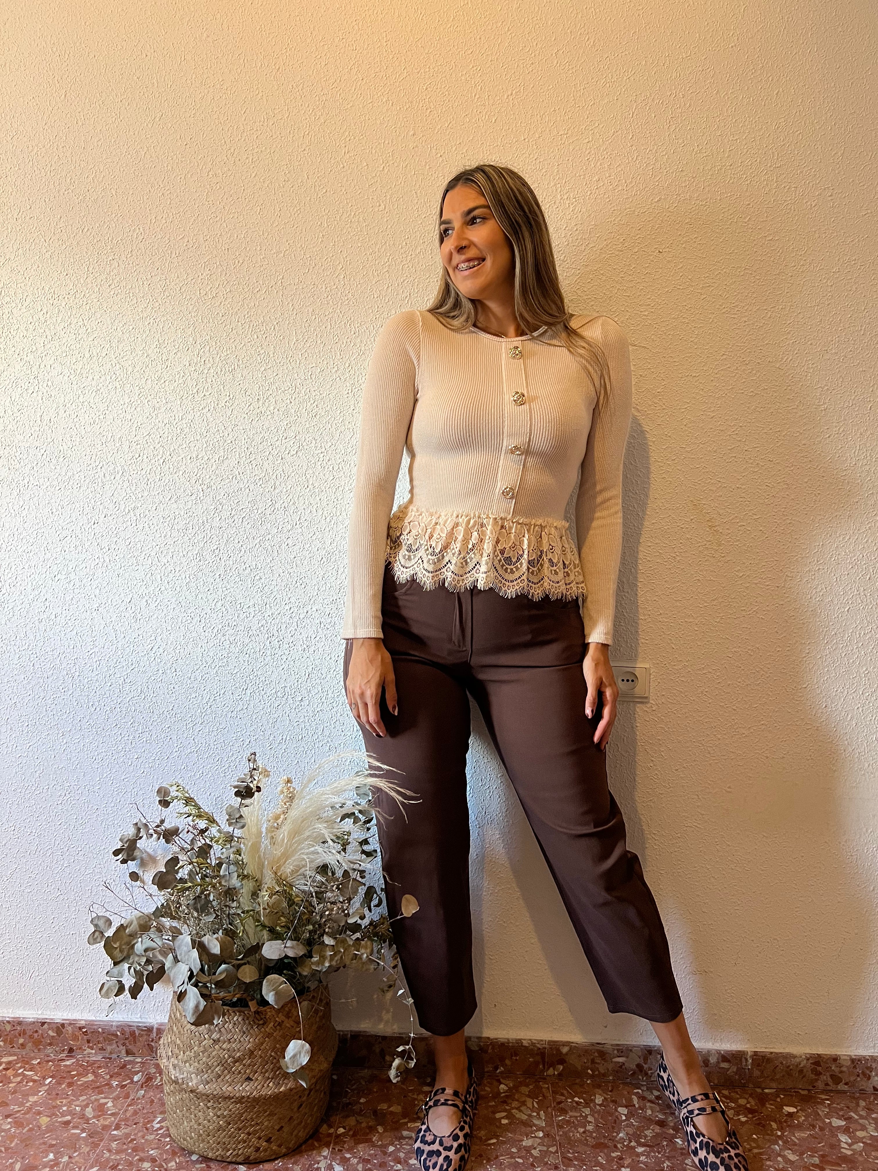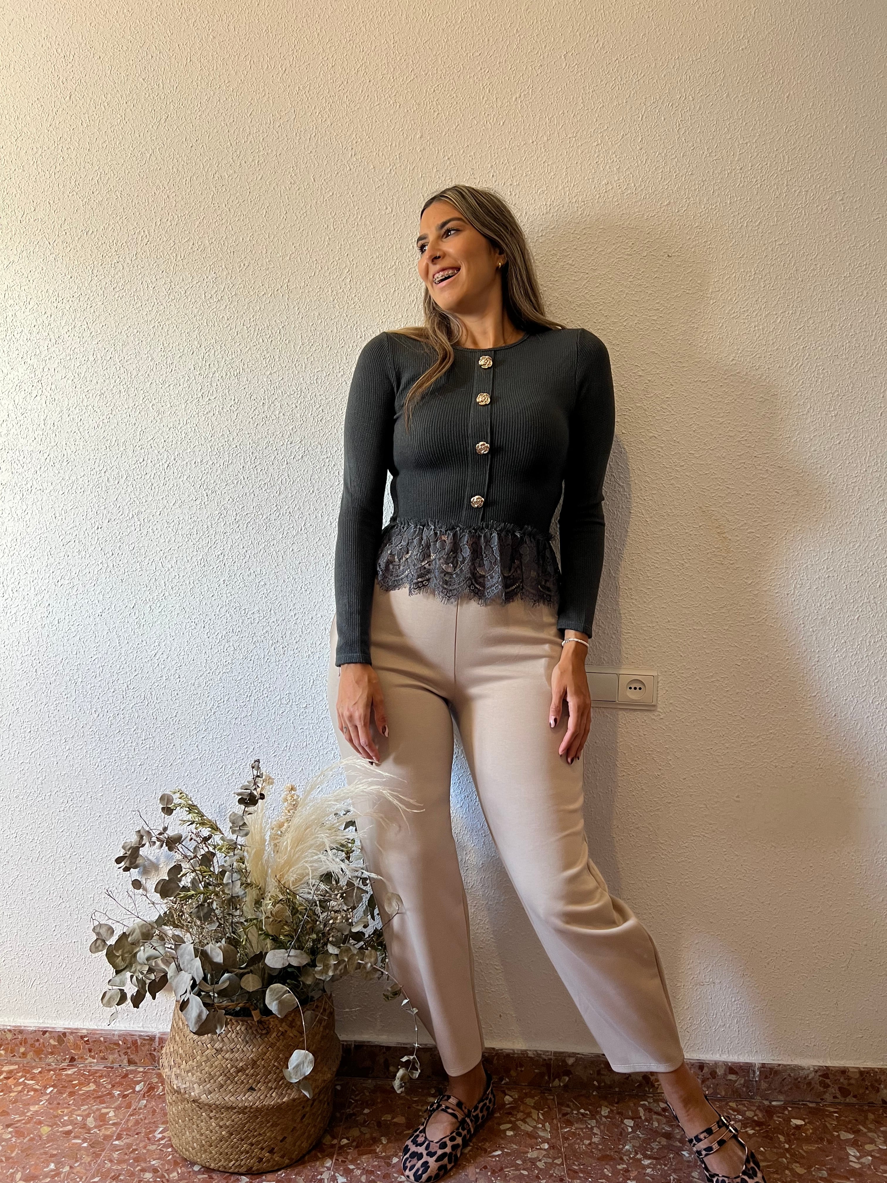 Camiseta de punto grueso con detalle de botones falsos y volante en encaje.